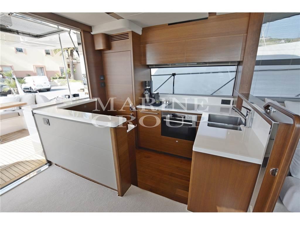 Interni in noce satinato - Cucina super accessoriata con finestra apribile sul pozzetto - Area da pranzo interna con divano in pelle e tavolo di fronte alla cucina - Spazioso salone con doppio divano e tv a scomparsa - Cabina armatoriale a centro barca con bagno ensuite ed accesso con scala dedicata - Area ospiti con scala separata che conduce a cabina Vip a prua con bagno ensuite, due cabine ospiti con letti singoli convertibili elettricamente in matrimoniale e bagno ospiti con doppia porta di accesso - Cabina equipaggio a poppa per due persone e bagno privato