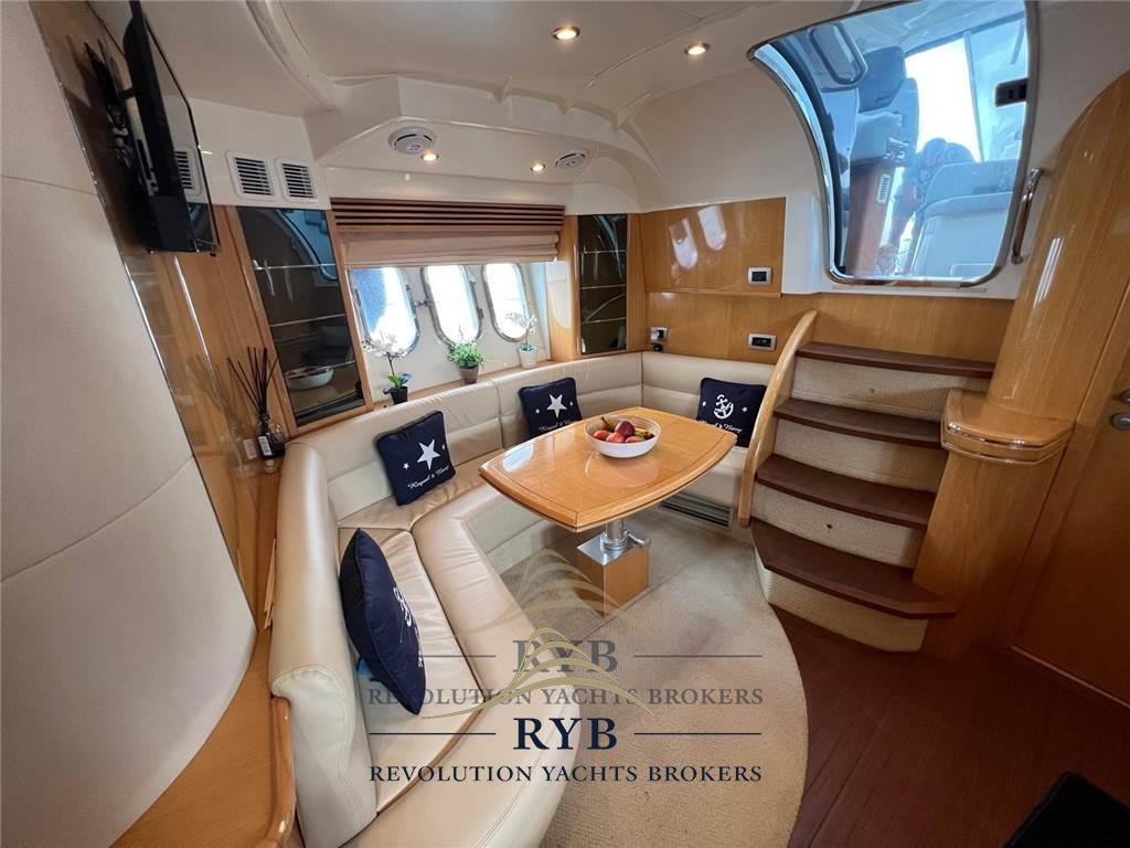 Molto ben accessoriata: 2 cabine e 2 bagni, dinette con divano in pelle, cabina armatoriale con bagno privato, cabina ospiti doppia, passerella idraulica a scomparsa, garage per tender....