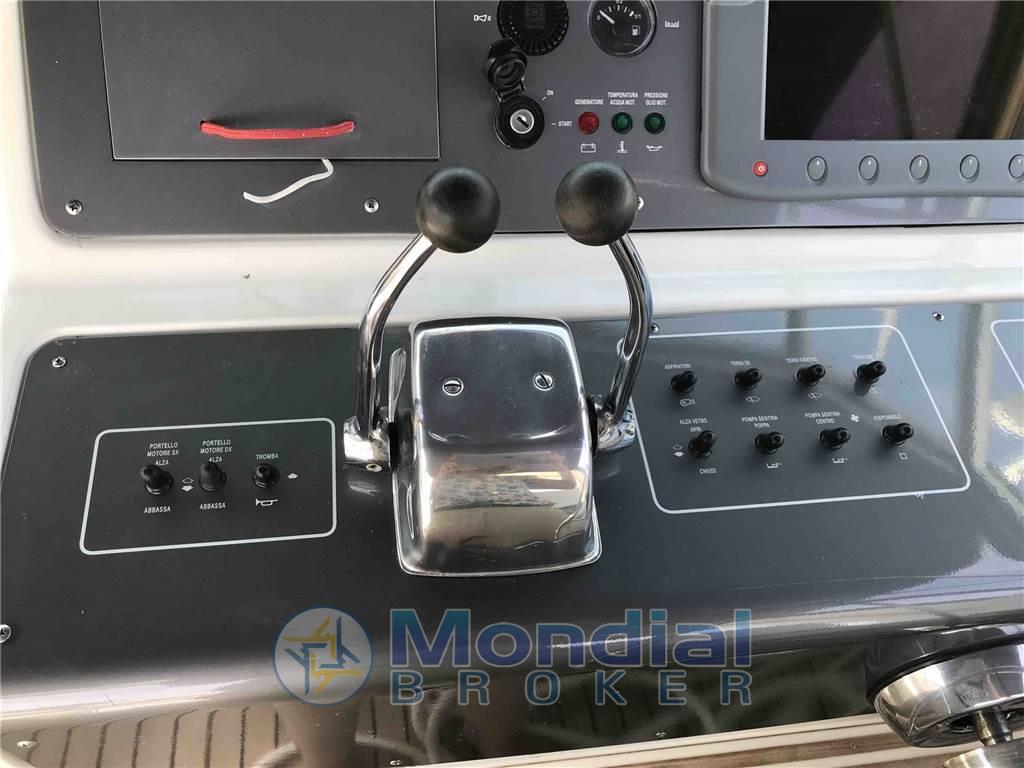 Cruscotto con manette marce e gas e con strumentazione contagiri, temperatura acqua , volt, pressione olio motori, invertitori e turbine, contaore, livello carburante e angolo di barra con allarmi visivi e acustici.
