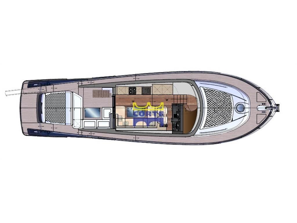 Fly attrezzato con seconda postazione di guida Garmin cartografico. mobile con piastra cottura, frigo, tavolo con dinette e bimini top.