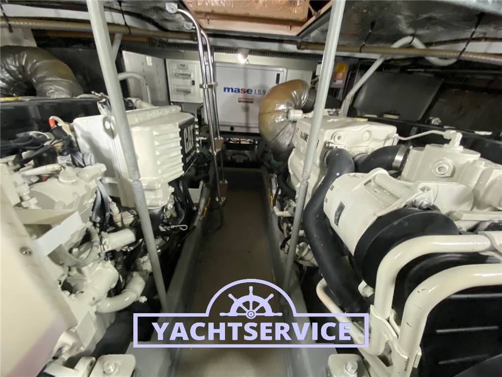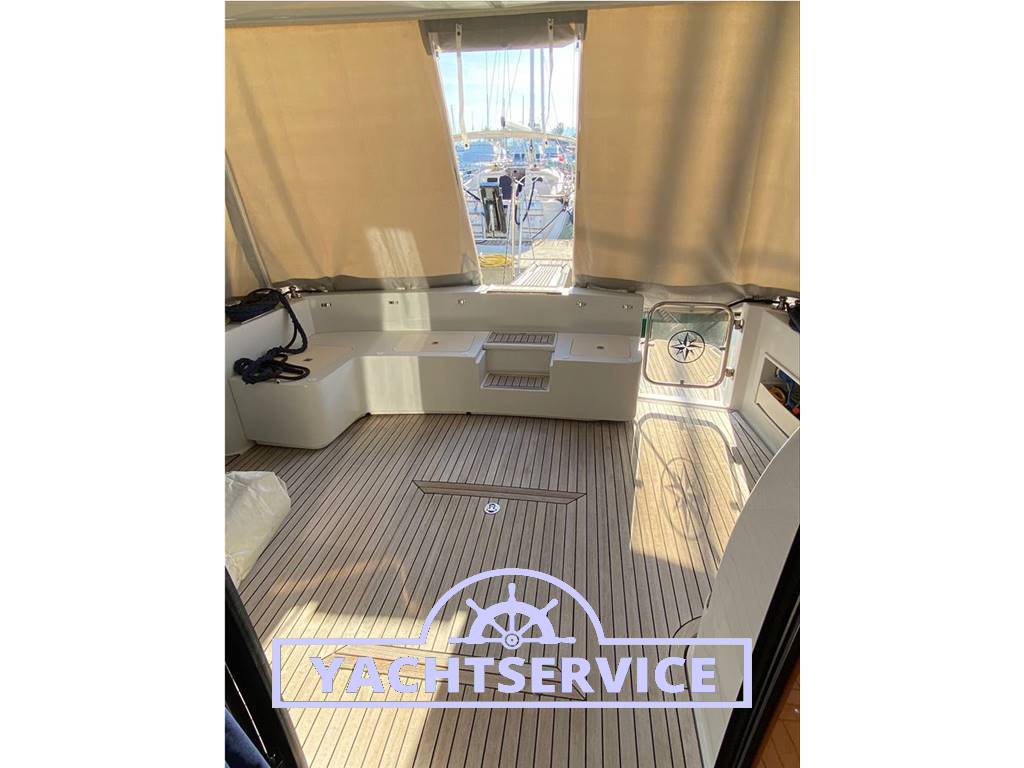 Imbarcazione con 3 cabine e 2 bagni dotati di box doccia, una matrimoniale a prua + 2 cabine gemelle con letti in piano a centro barca. Cabina marinaio 1 posto letto, attrezzata con servizi e lavatrice. Divani in pelle, calpestio interno tutto in teak con doghe in acero filettato bianco, mobilio in ciliegio. Impianto di aria condizionata in tutti gli ambienti, generatore 9 kw, elica di prua + elica di manovra a poppa, ancora da 20 kg con contacatena, lavaggio catena. Piano cottura induzione 4 fuochi, Lavatrice, ghiacciaia sul fly, winch di tonneggio a poppa, seconda autoclave.