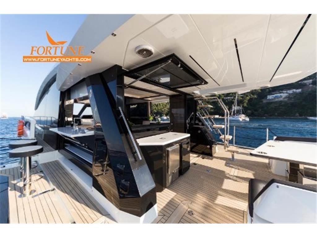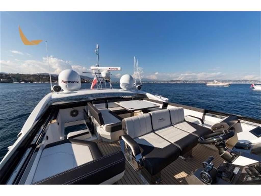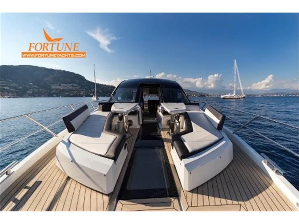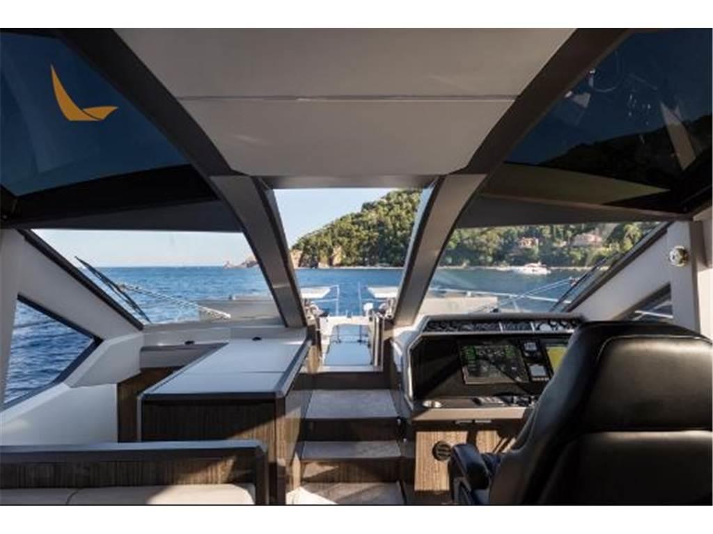 All'esterno, la zona pranzo del pozzetto di poppa ospita otto persone che possono godere di un sistema di intrattenimento con una TV a schermo piatto che scorre dal piano cucina, il tutto protetto dagli elementi dal parasole elettrico di poppa. Più indietro, si trova la piattaforma da bagno idraulico in grado di gestire tutti gli accessori per l'acqua e un comodo accesso a una cabina per skipper di grandi dimensioni. Il ponte superiore offre tre sedili sportivi e un prendisole per il tempo libero, mentre l'area del ponte di prua può essere raggiunta dal rivoluzionario ingresso elettrico della finestra anteriore che rivela due divani mobili separati con tavoli pieghevoli integrati per il solarium.