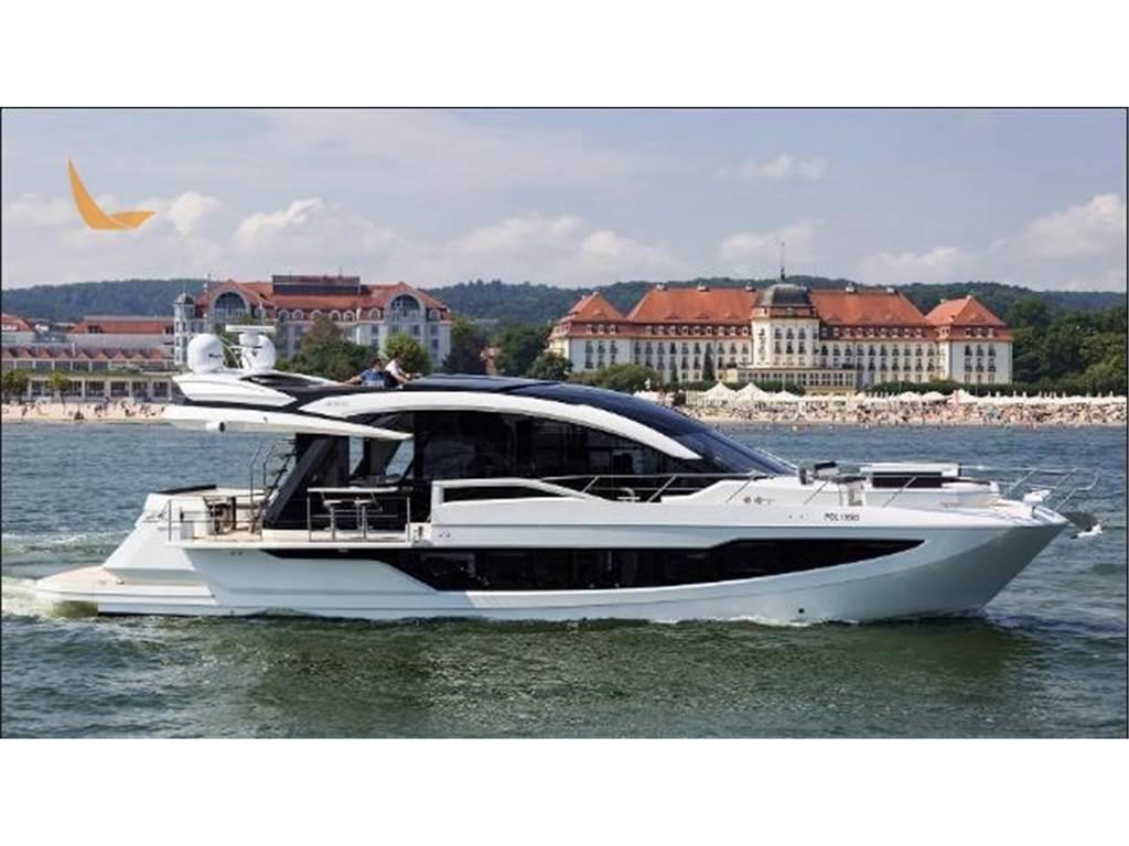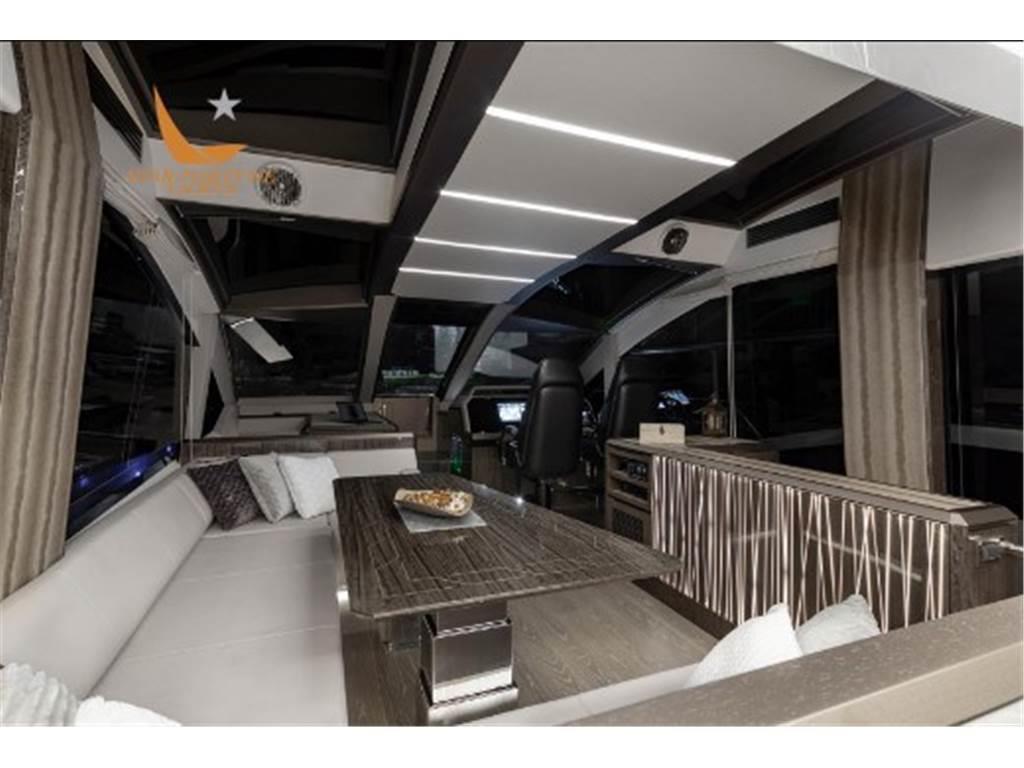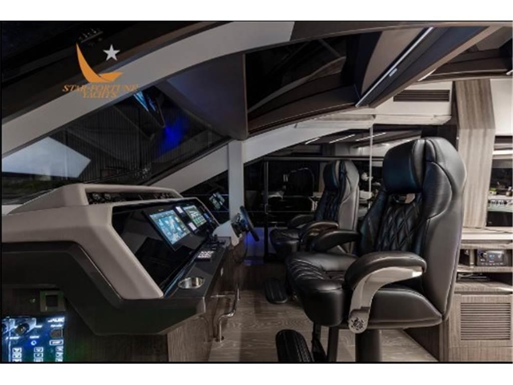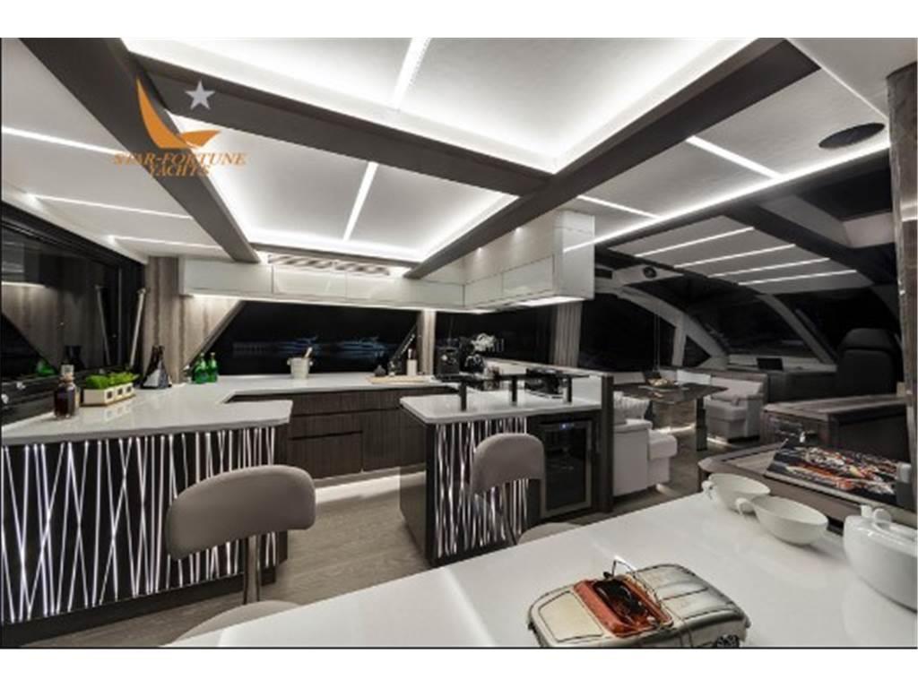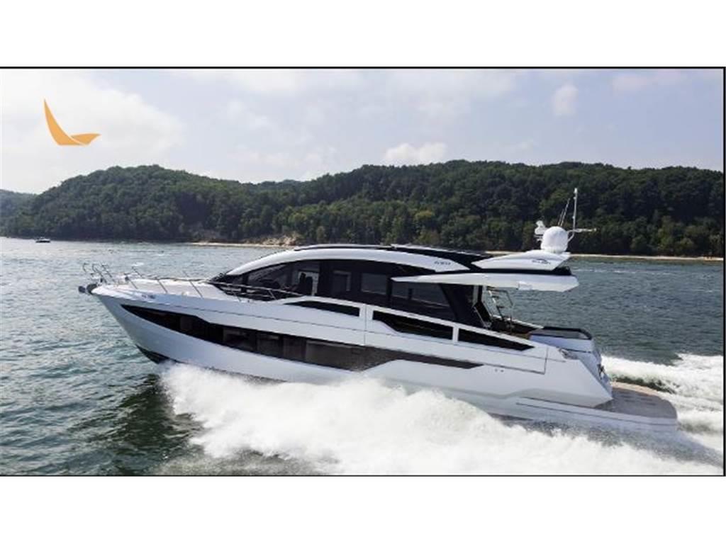All'esterno, la zona pranzo del pozzetto di poppa ospita otto persone che possono godere di un sistema di intrattenimento con una TV a schermo piatto che scorre dal piano cucina, il tutto protetto dagli elementi dal parasole elettrico di poppa. Più indietro, si trova la piattaforma da bagno idraulico in grado di gestire tutti gli accessori per l'acqua e un comodo accesso a una cabina per skipper di grandi dimensioni. Il ponte superiore offre tre sedili sportivi e un prendisole per il tempo libero, mentre l'area del ponte di prua può essere raggiunta dal rivoluzionario ingresso elettrico della finestra anteriore che rivela due divani mobili separati con tavoli pieghevoli integrati per il solarium.