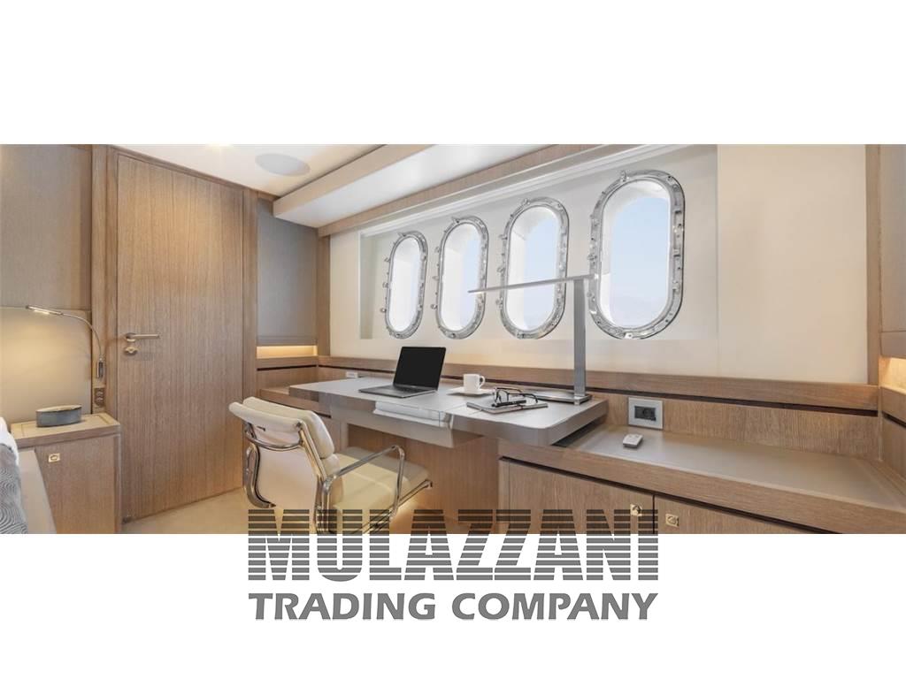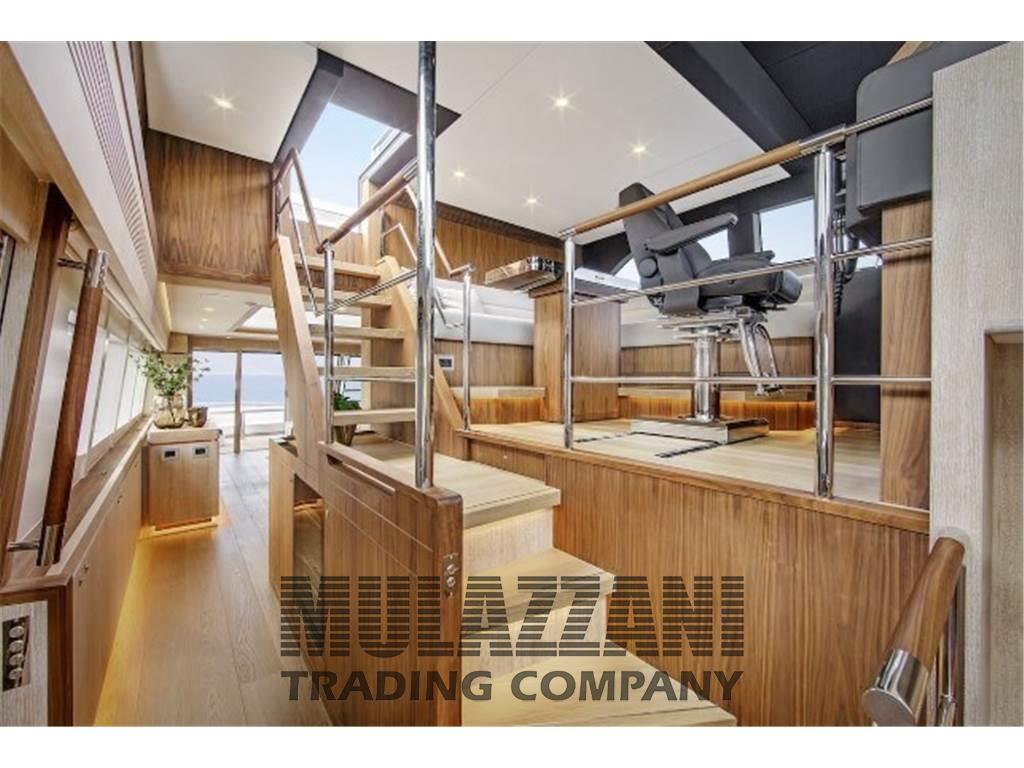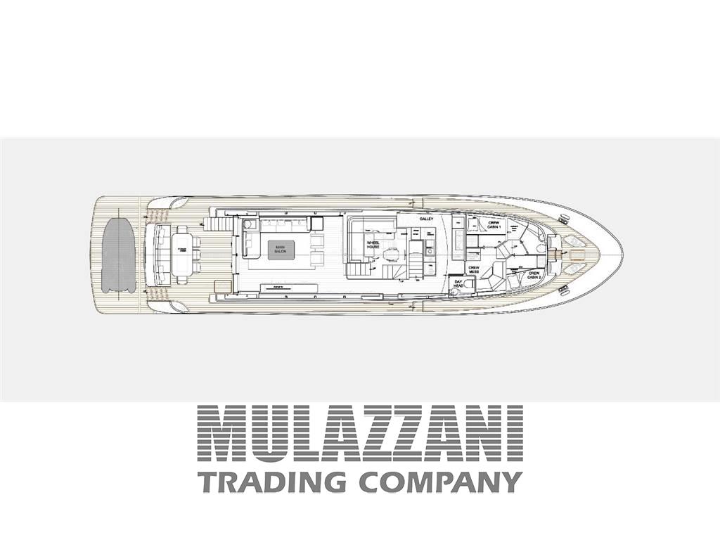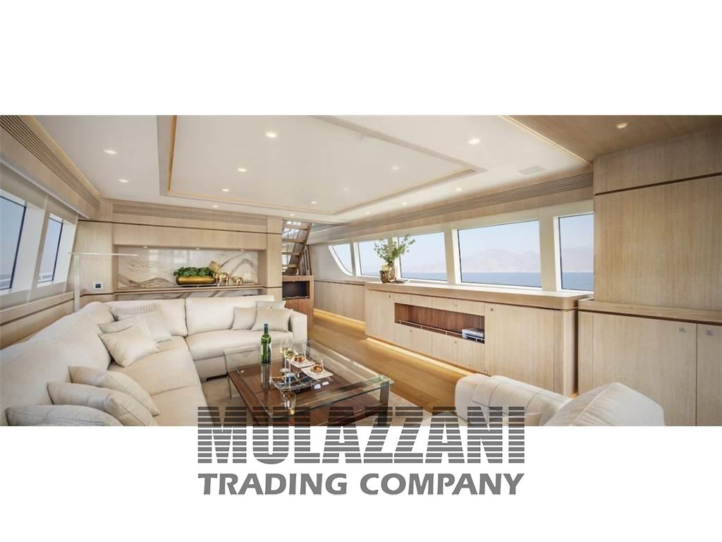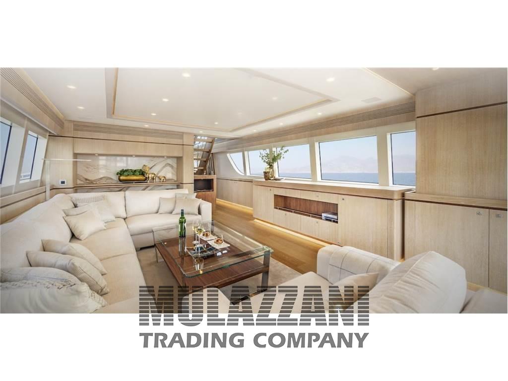 Layout con un ampio salone principale con divani e poltrone e un'ampia zona salotto nella timoneria, con cucina a prua con piani in corian (anche nei bagni). Day toilet.