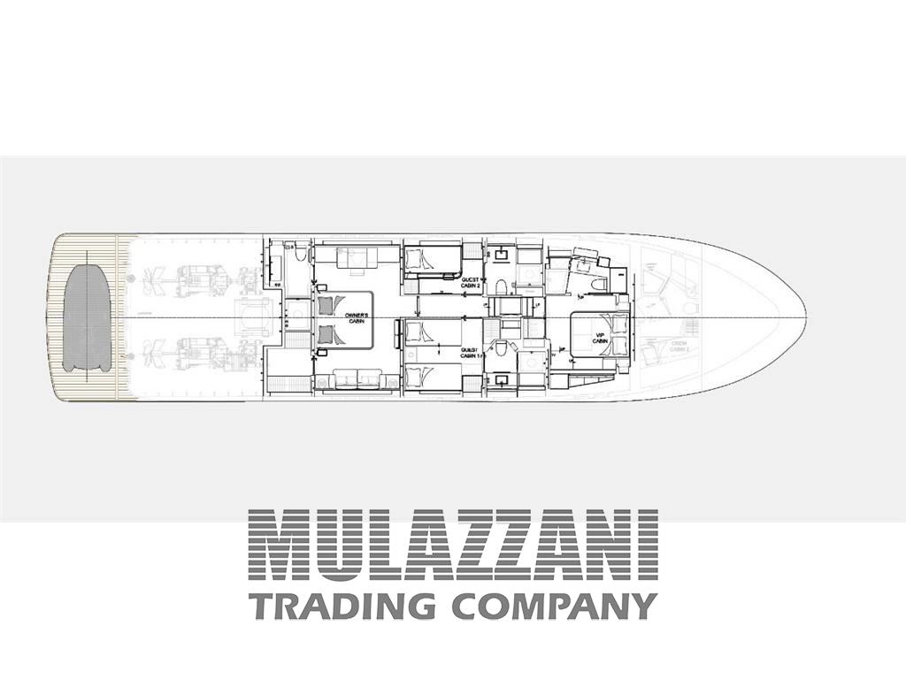 1 armatoriale matrimoniale king size a tutto baglio centro nave con scrivania, area salotto e cabina armadio; 1 VIP matrimoniale a prua; 1 ospite doppia (letti scorrevoli); 1 ospite a castello; bagno privato in ogni cabina (cabine doccia e pareti bagni in corian e ceramica, wc/bidet elettrici Planus).