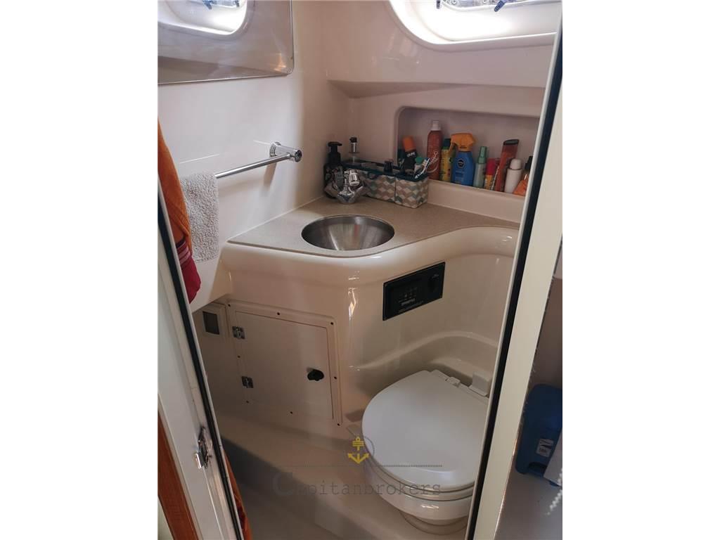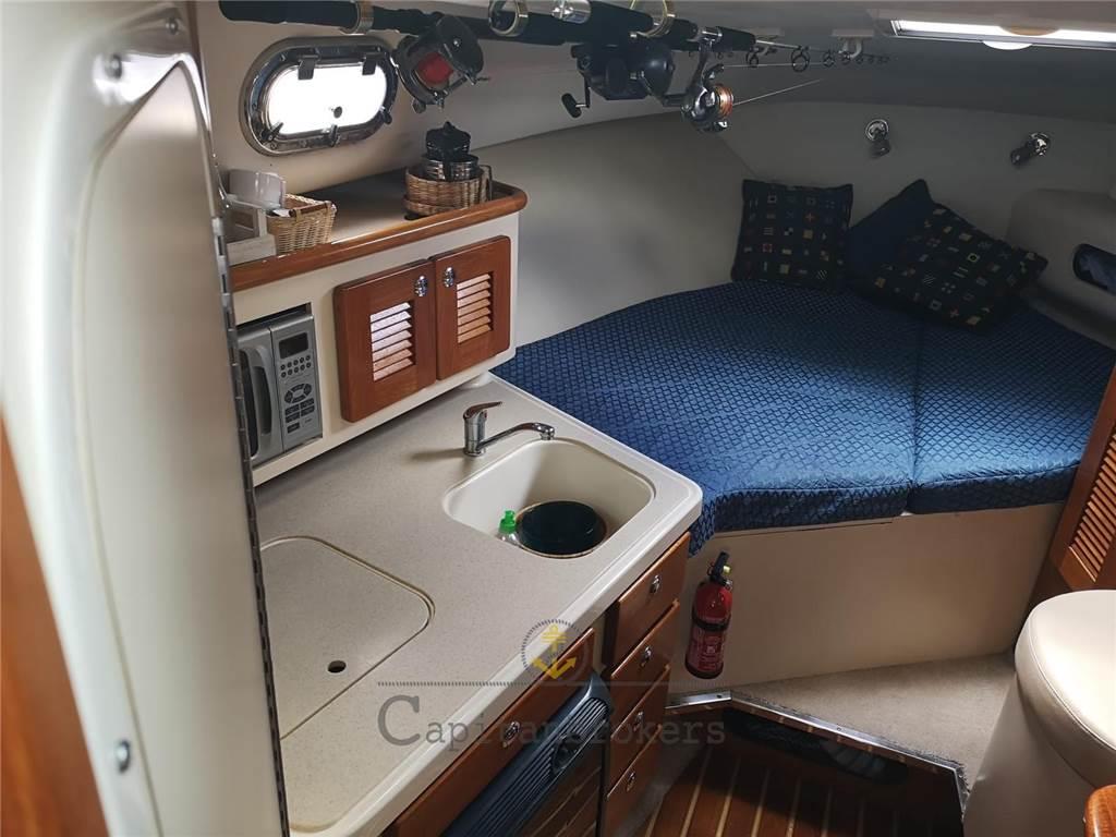 Pursuit Os 335 con letto matrimoniale rovesciato a V di prua, bagno con doccia, cuccetta ospiti a centro barca, interni in buono stato, paiolato interno in legno, mobili di pregio in legno lucidi.