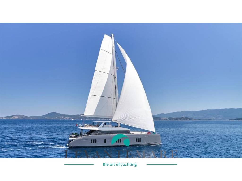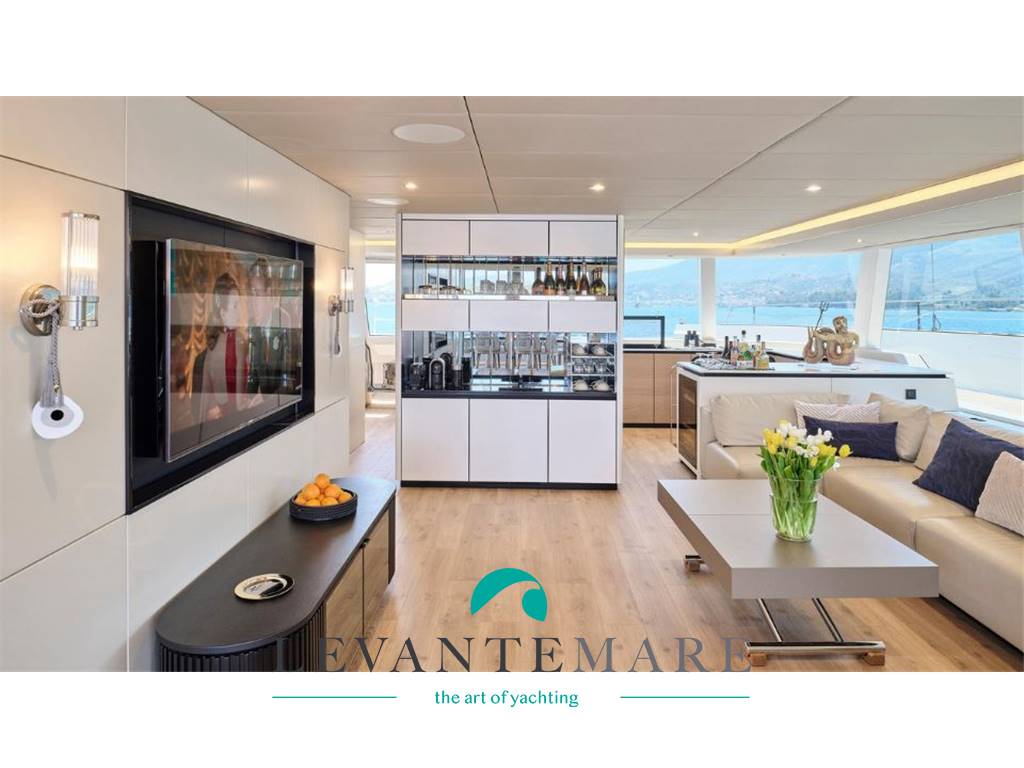 Progettato per ospitare fino a 10 persone, offre 5 cabine di lusso, ognuna curata nei minimi dettagli per garantire il massimo del comfort e della privacy, gli interni di questo Sunreef 80 sono ampi e arredati con gusto: un grande salone, una cucina completamente attrezzata e zone pranzo raffinate creano un ambiente accogliente e moderno. Le ampie vetrate panoramiche inondano gli spazi di luce naturale, donando un’atmosfera luminosa e ariosa. Finiture di alta qualità e dotazioni moderne completano l’esperienza a bordo, rendendola davvero esclusiva.