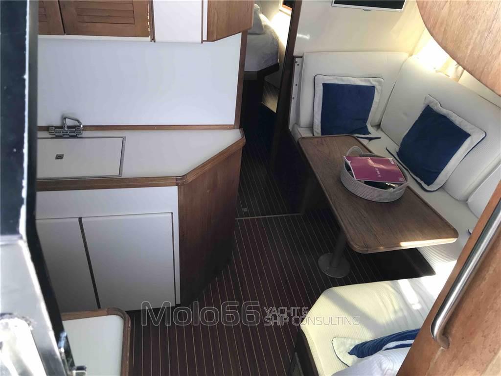 Una cabina armatore a prua con letto matrimoniale e armadio, bagno con doccia separata, dinette trasformabile in letto matrimoniale , angolo cottura con lavandino , fornello 2 piastre a gas ,frigorifero, armadietti vari.