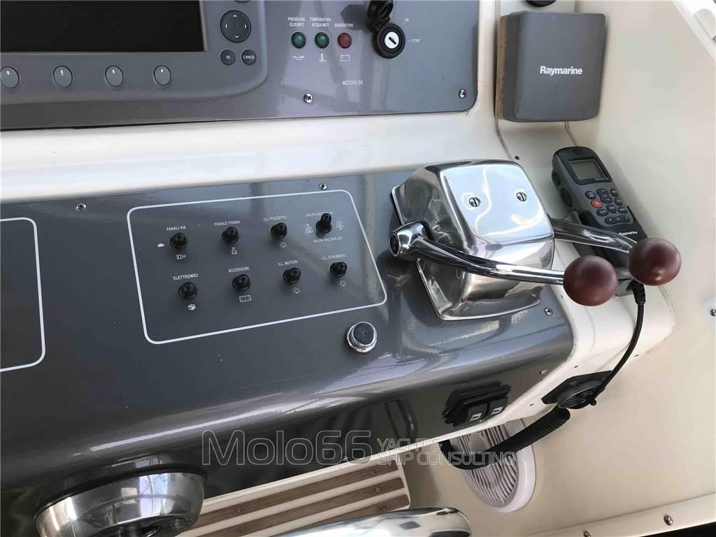 Allarme fumo/gas, Allarme motore, Allarme sentina, Ancora, Apertura Vano Motore Elettrica, Autoclave, Autogonfiabile, 5 Batterie, Bussola, Caricabatterie, Cavo corrente di banchina, Contamiglia, Corrimano, Display, Doccia esterna, DSC vhf, Ecoscandaglio, Elica di prua - bow thruster, 2 Elica di rispetto, Fari fissi a poppa, Flap idraulici, Impianto antincendio, Indicatori Flaps, Lavandino nel Pozzetto, Log, Luci di cortesia, Luci di navigazione, Mappe e guide, Monitor dei consumi, Motore fuoribordo per tender, 6 Parabordi, Passerella, Piattaforma, Pilota automatico, Plotter con antenna GPS, Pompa di sentina automatica, Pompa di sentina manuale, Porta ingresso, Pozzetto Teak, Presa 220V banchina, Presa acqua banchina, Quadro comandi, Radar, Radio VHF, Rollbar, Salpa Ancore Elettrico, Scaletta da bagno, Sedile Copilota, Sonar, Tavolo pozzetto, Tender, Tromba, Winch tonneggio di prua