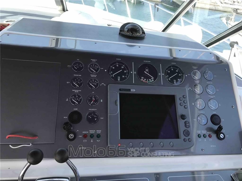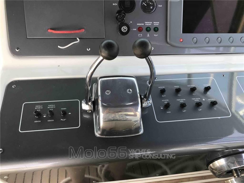 Cruscotto con manette marce e gas e con strumentazione contagiri, temperatura acqua , volt, pressione olio motori, invertitori e turbine, contaore, livello carburante e angolo di barra con allarmi visivi e acustici.