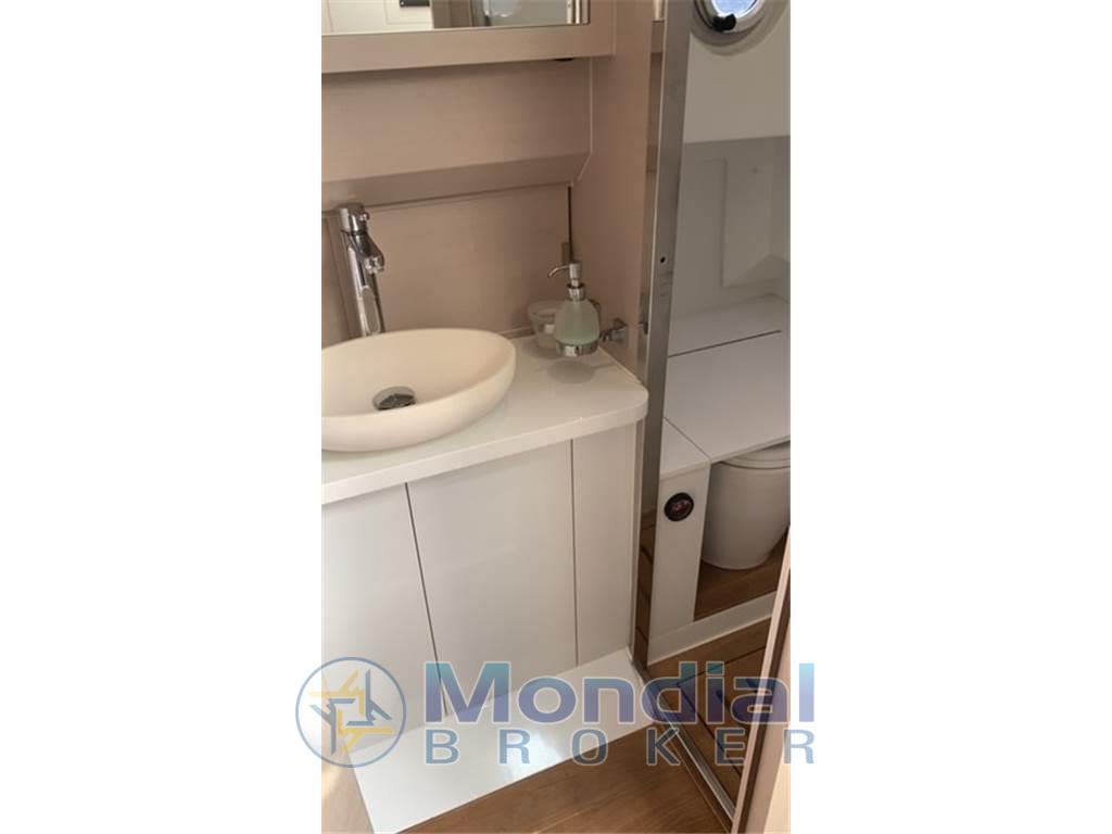 Dinette accogliente con divano, bagno elegante e completo, dotato di doccia separata, lavabo e WC elettrico per garantire comfort assoluto anche nelle crociere più lunghe-
