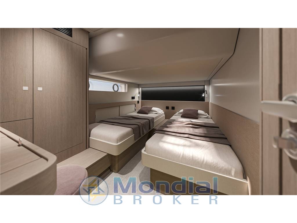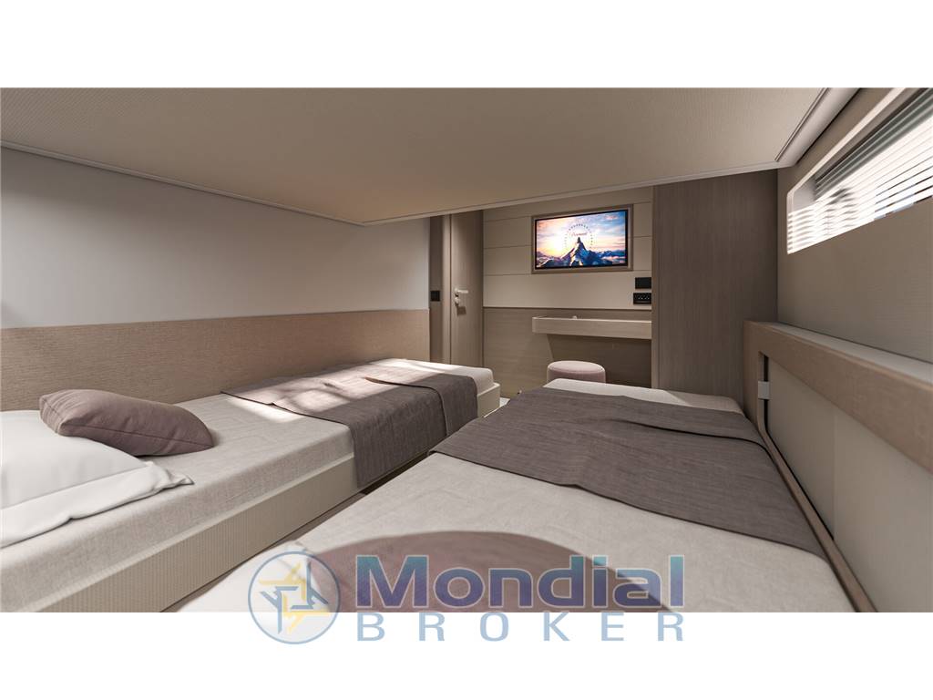 Gli interni, luminosi e raffinati, offrono ambienti accoglienti e finiture di pregio. La disposizione tipica prevede una cabina armatoriale full beam con bagno privato, cabine ospiti confortevoli, una dinette spaziosa e una cucina completamente attrezzata, pensata per garantire comfort anche durante crociere di più giorni. Materiali di alta qualità, cura dei dettagli e soluzioni intelligenti rendono ogni spazio funzionale ed elegante.