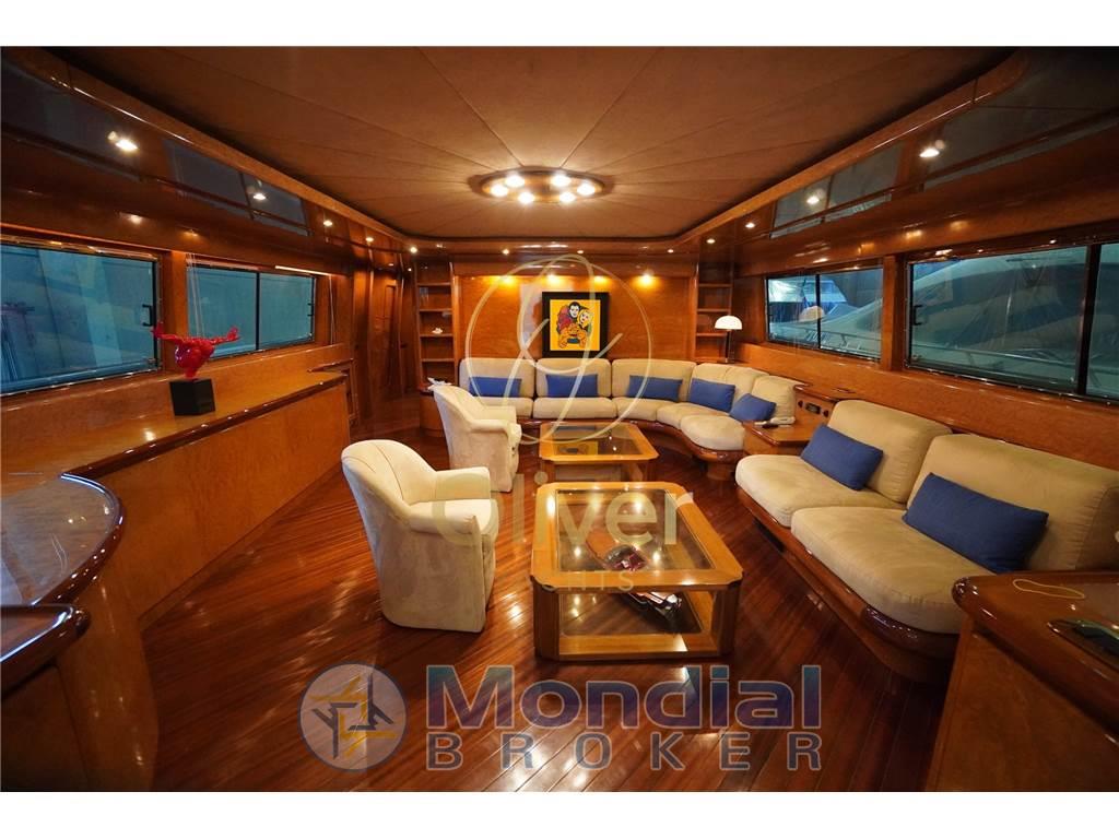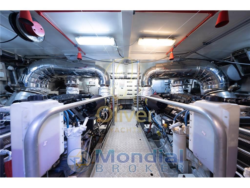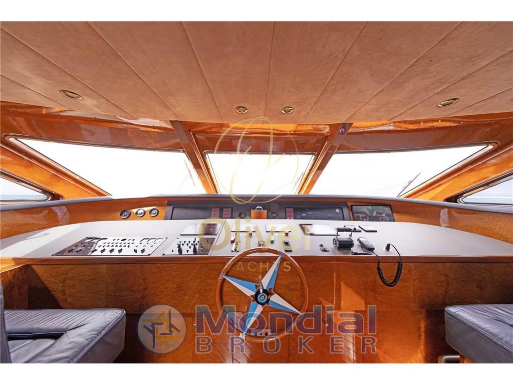AIS, Allarme fumo/gas, Allarme motore, Allarme sentina, Ancora, Angolo barra, Antenna radar (RAYMARINE), Autoclave, Autogonfiabile, Auto-Trim, Batterie, Bocche di Lupa, Bussola, Camminamenti laterali in teak, Caricabatterie, Comando motori elettronico (CAT), Computer di bordo, Contametri catena, Contamiglia (RAYMARINE), Cronometro, 2 Display (RAYMARINE), Doccia esterna, Doppia timoneria, DSC vhf, Ecoscandaglio (RAYMARINE), Elica di prua - bow thruster, Faro orientabile, Flap idraulici, GPS, Gruette per tender su fly, Impianto antincendio, Impianto Aria Compressa, Indicatori Flaps, Interfaccia, Interfono, Log, Luci di cortesia, Luci subacquee, Passerella, Piattaforma, Pilota automatico (RAYMARINE), Plotter (RAYMARINE), Plotter con antenna GPS (RAYMARINE), Pompa di sentina automatica, Pompa di sentina elettrica, Pompa di sentina manuale, Porta ingresso, Porta laterale, Pozzetto Teak, Presa 220V banchina, Presa acqua banchina, Radar (RAYMARINE), Raddrizzatore, Radio VHF, Ripetitore strumentazione, Rollbar, Salpa Ancore Idraulico, Scaletta da bagno, Sedile Copilota, Selle per Tender, Sistema Depurazione acque nere, Stazione vento, Tavolo pozzetto, Tender, Tientibene con cancelletti, Tromba, Tuga in teak, Winch tonneggio di poppa, Winch tonneggio di prua
