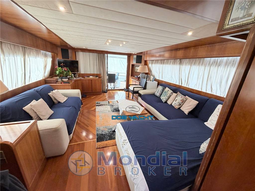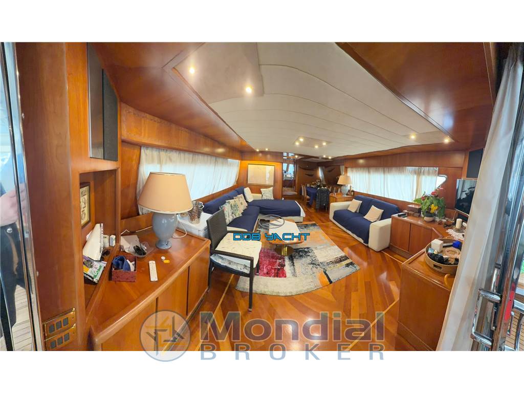FLY: con accesso dalla scala interna, plancia comando con seduta pilota e co pilota, divani contrapposti con tavoli, mobile living con lavabo e frigo, ampio prendisole sul lato dritto, a poppa via zona ricovero TENDER con gruetta, tendalino parasole.