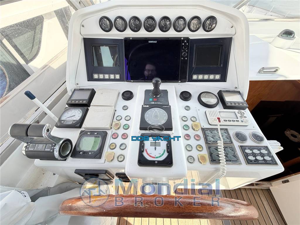 strumenti motore con indicatori analogici, doppio display strumentazione MTU con lettura digitale , manette elettroniche, doppio gps SIMRAD, radar CHART PLOTTER EXPLORER NK2, vhf SIMRAD RS20, vhf SAILOR COMPACT 2048, rudder elettronico SIMRAD IS15, strumento B&G NETWORK QUAD, strumento B&G NETWORK DEPTH, flaps con indicatori analogici, pilota automatico SIMRAD AP26, bussola RITCHIE/ CETREK COMPASS, luci via, tromba, telecamera di manovra poppa e sala macchine, angolo di barra, tergicristalli con comandi; STRUMENTAZIONE FLY: strumenti motore con indicatori analogici, doppio display strumentazione MTU con lettura digitale , vhf ICOM, flaps con indicatori analogici, pilota automatico SIMRAD AP26, bussola RITCHIE/ CETREK COMPASS, tromba, luci di via, gps SIMRAD, strumento B&G NETWORK QUAD, strumento B&G NETWORK DEPTH, elica di prua, angolo di barra .