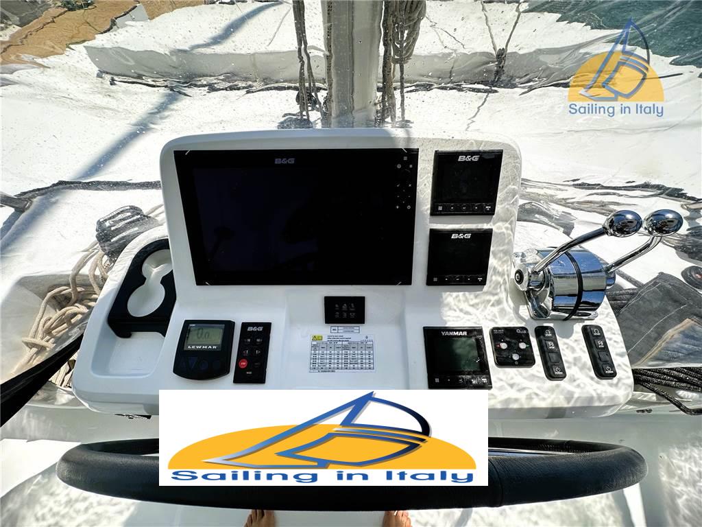 Elettronica B&G completa: 3 plotter (Zeus 16" + 12" + al carteggio), radar, AIS 500, ecoscandaglio con visione in avanti, autopilota, VHF doppio, stazione vento, joystick di manovra ; Elica di prua (Bow Thruster 24V 140kgf) ; Dissalatore, aria condizionata (64.000 BTU con controllo per cabina) ; Inverter 2 kW, batterie supplementari AGM 140Ah, pannelli solari 8x115W ; Tender Highfield 340 con Mercury 15HP, gruette in acciaio inox con telecomando ; Passerella in carbonio 3m, piattaforma idraulica tender lift, tavolo pozzetto in teak estendibile ;