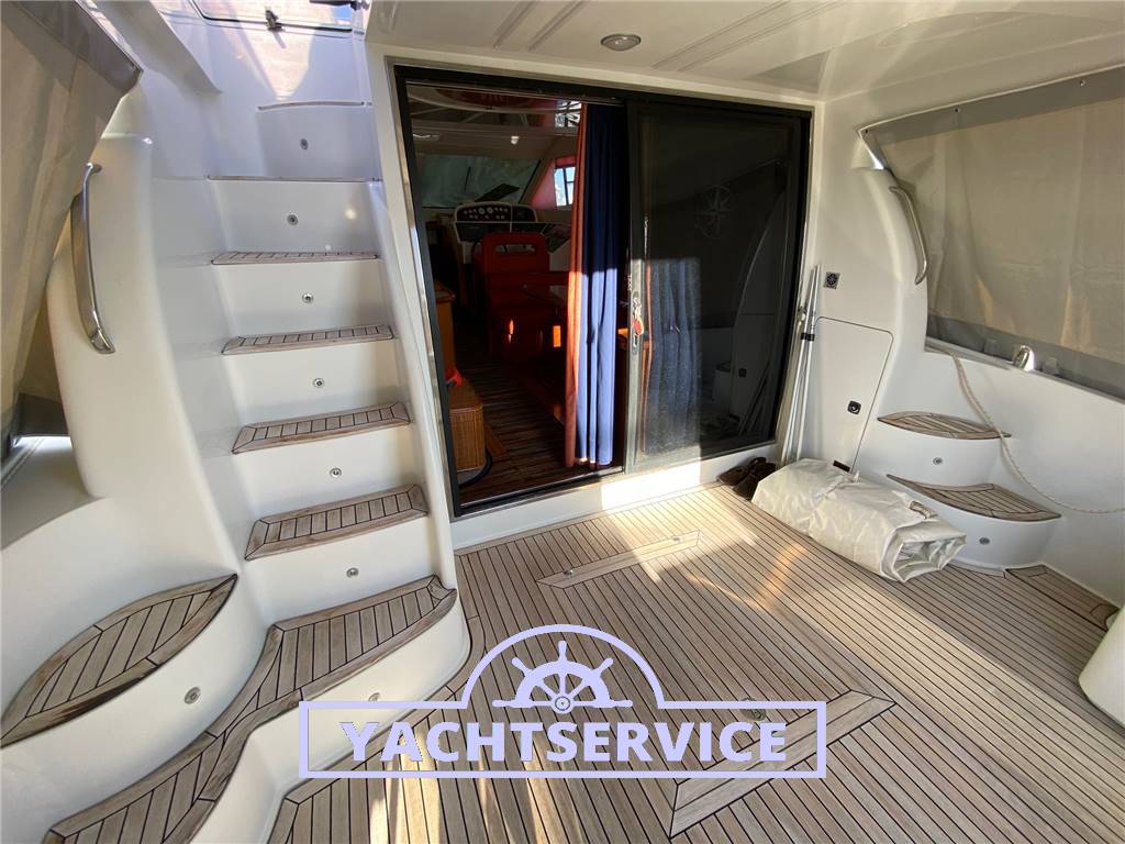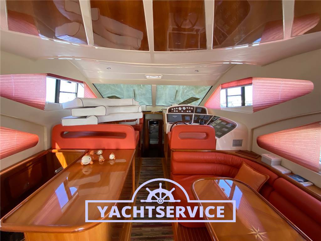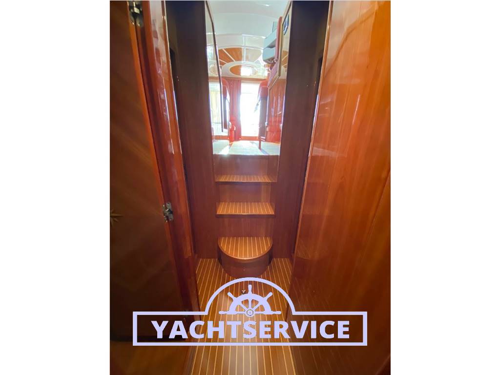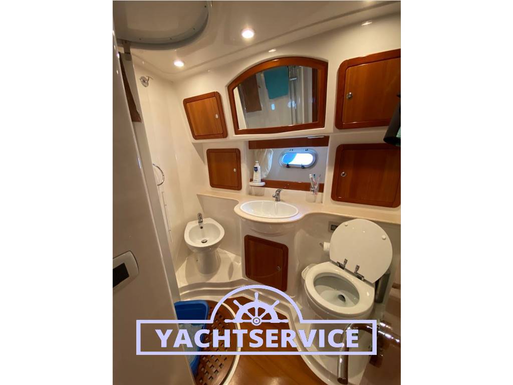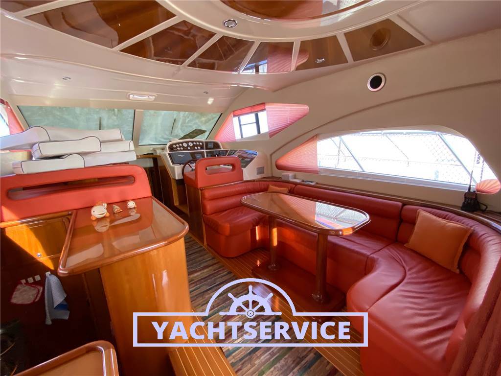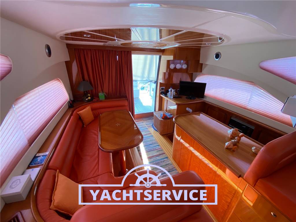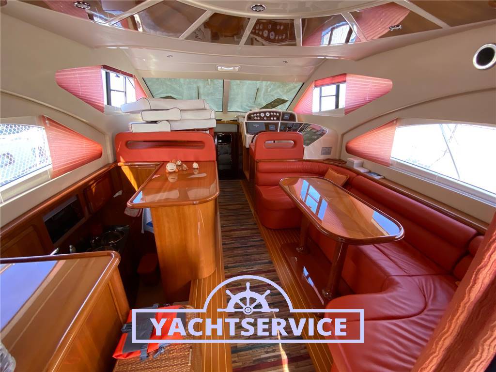 Imbarcazione con 3 cabine e 2 bagni dotati di box doccia, una matrimoniale a prua + 2 cabine gemelle con letti in piano a centro barca. Cabina marinaio 1 posto letto, attrezzata con servizi e lavatrice. Divani in pelle arancione chiara, calpestio interno tutto in teak con doghe in acero filettato bianco, mobilio in ciliegio. Impianto di aria condizionata in tutti gli ambienti, generatore 9 kw, elica di prua + elica di manovra a poppa, ancora da 20 kg con contacatena, lavaggio catena. Piano cottura induzione 4 fuochi, ghiacciaia sul fly, winch di tonneggio a poppa, seconda autoclave.