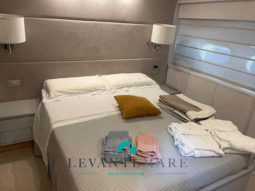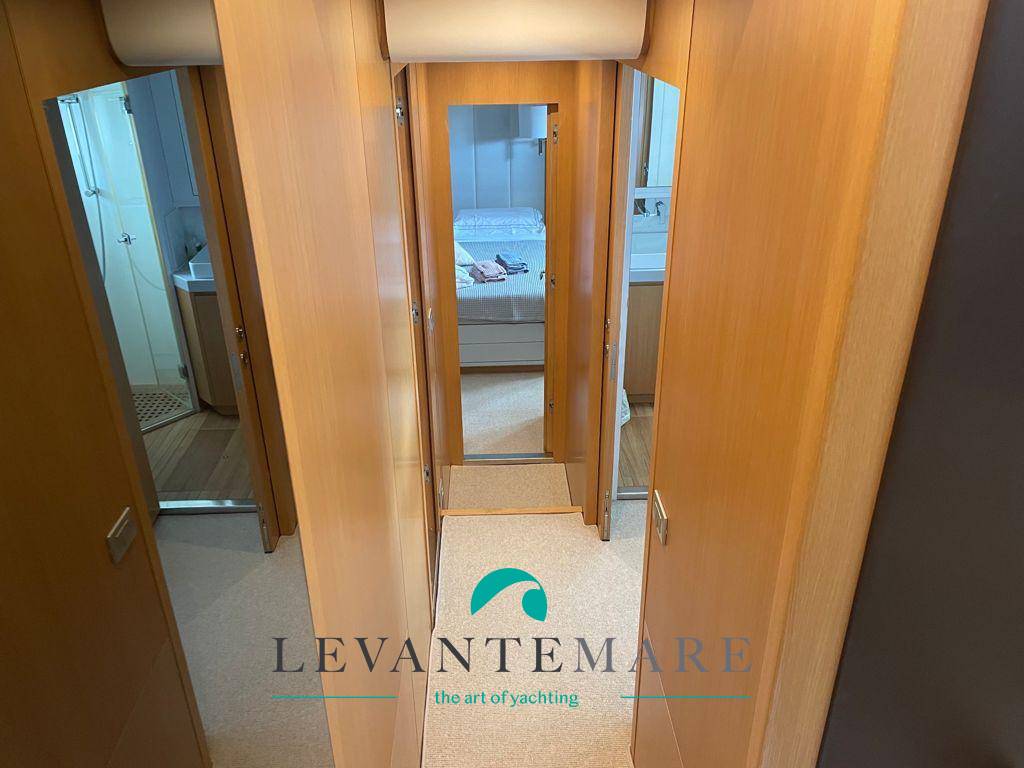 LOWER DECK: quattro cabine, una suite armatoriale a centro barca con sistemazione completa. La cabina VIP è a prua con bagno en suite, due cabine per gli ospiti, una con due cuccette e una con 1 letto singolo. Gli alloggi dell’equipaggio si trovano a poppa.