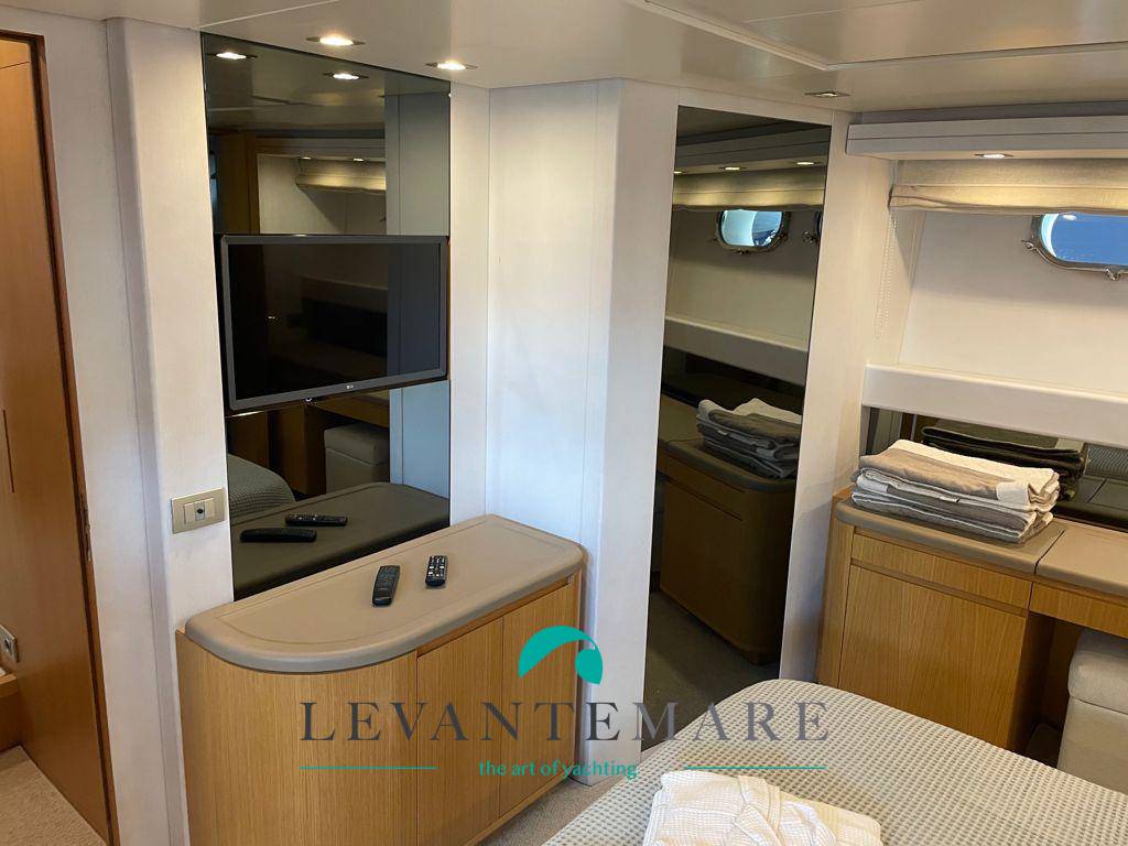 Monitor, Chart Plotter Raymarine, Autopilota Raymarine, Radar Raymarine, Ecoscandaglio Raymarine, VHF Raymarine RAY240E, Navtex, Bussola, Timone, TV satellitare Tracvision, Batterie di servizio, Batterie motori, Batterie generatori, Alimentazione a terra, Inverter, Caricabatterie Mastervolt, Aria condizionata Condaria, Elica di prua Sidepower, Elica di poppa Sidepower, Ventilazione macchine, Indicatore dei flaps, Stabilizzatori Waveless a pinne, Pompa di sentina elettrica e manuale, Dissalatore HP Watermakers, Passerella idraulica, Scaletta bagno, Tonneggio, Verricello, Ancora, Catena, Scaletta laterale, Zattere