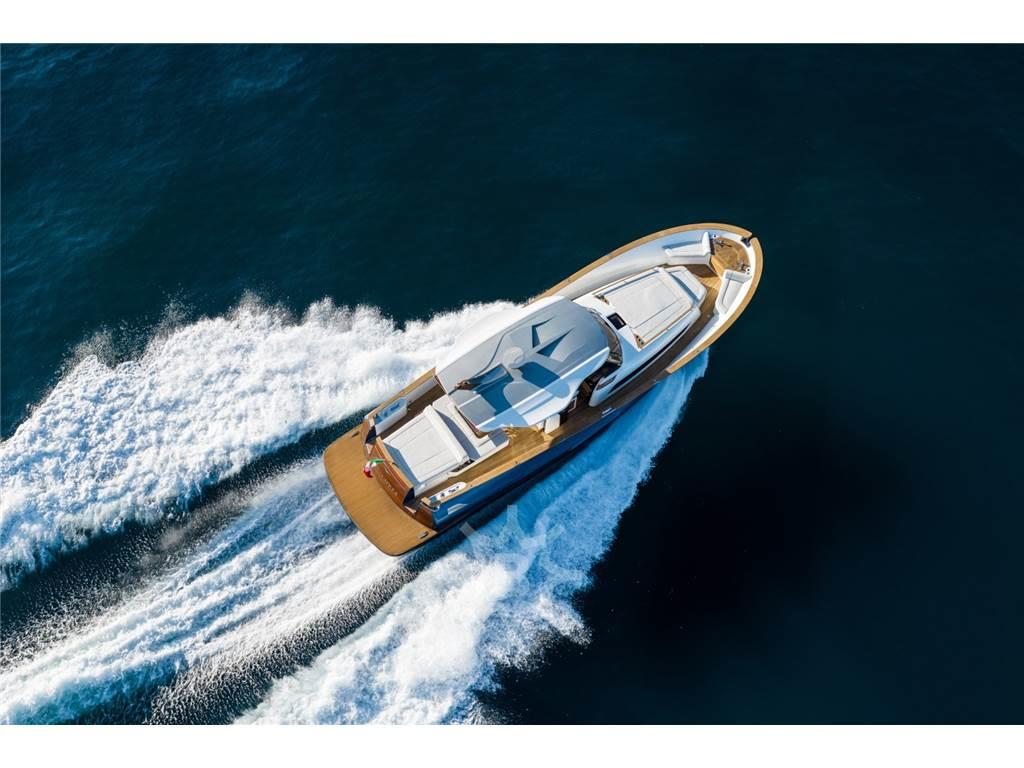 Angolo barra, Auto Dynamic Trim Interceptor, Autoclave, Bitte Abbattibili (in plaancetta di poppa), Bussola, Camminamenti laterali in teak, Caricabatterie, Colorazione speciale (blu metallizzato), Comando motori elettronico, Contamiglia, Display (multifunzione maggiorato), Doccia esterna, Ecoscandaglio, Elica di prua - bow thruster, GPS, Joystick (Volvo Penta), Lavandino nel Pozzetto, Log, Luci di cortesia, Passerella (idraulica con gradini orientabili), Piattaforma (abbattibile in teak), Pilota automatico, Pozzetto Teak, Presa 220V banchina, Presa acqua banchina (anche a prua), Radar, Radio VHF, Salpa Ancore Elettrico, Scaletta da bagno, Sedile Copilota, Sistema di posizionamento dinamico, Tavolo pozzetto, Winch Elettrico (a prua), 2 Winch tonneggio di poppa