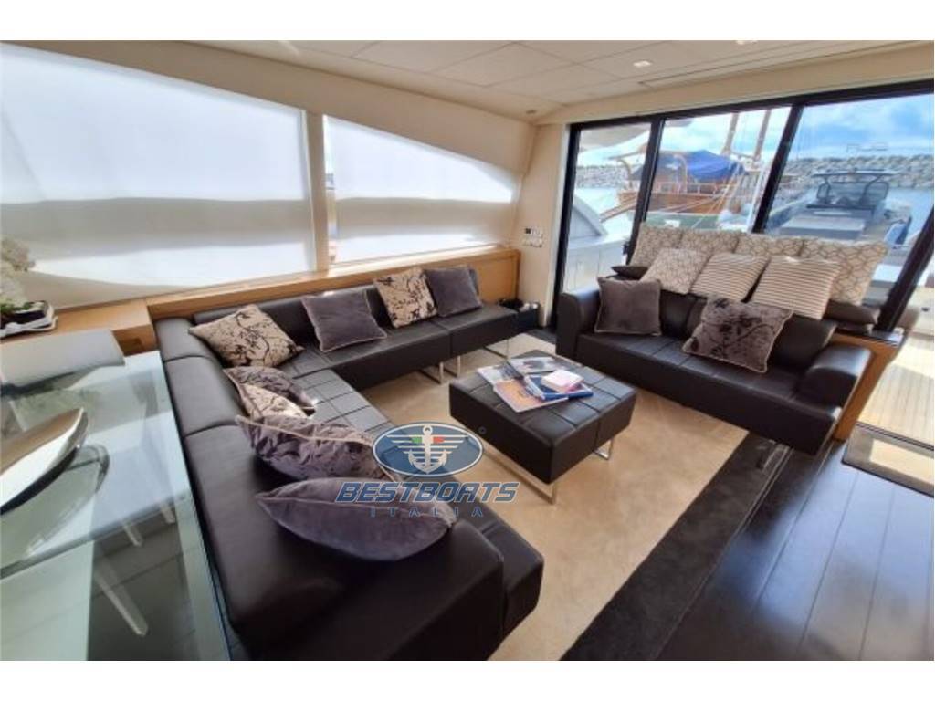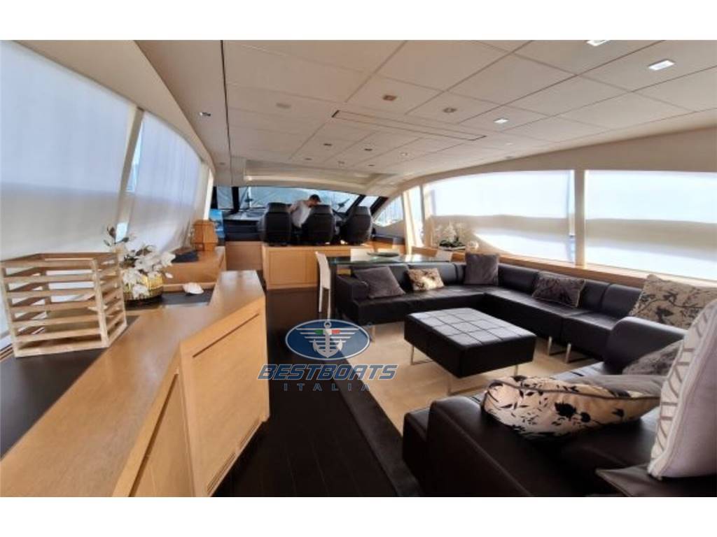 Soggiorno molto ampio con divano in pelle FRAU ad "U", Tavolino, angolo bar con frigobar, TV a scomparsa 49" con un Bose PM425, Decoder SKY HD, Tende elettriche e porta principale scorrevole, Plancia comandi con 3 sedili Besenzoni Elettrici in pelle, Cruscotto e porte laterali elettriche.
