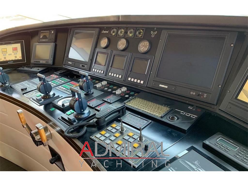 Allarme fumo/gas, Allarme motore, Allarme sentina, Altoparlanti, Ancora, Angolo barra, Aria condizionata, Autoclave, Auto-Trim, Batterie, Boiler, Camminamenti laterali in teak, Caricabatterie, Clima reversibile, Collegamento internet, Congelatore, Controllo Domotica, Cucina, Cuscineria completa, Cuscineria di poppa, Cuscineria di prua, Cuscineria Pozzetto, Dimmer per Luci, Dissalatore, Doccia esterna, Elica di poppa - stern thruster, Elica di prua - bow thruster, Faro orientabile, Flap idraulici, Forno, Frigorifero esterno, Frigorifero interno, Garage per tender, Gruette per moto d'acqua, Gruette per tender, Hard top, Home Theater (Home Cinema with 60" 3D Screen), ICE Maker, Impianto acque nere, Impianto antincendio, Impianto TV, Indicatori Flaps, Inverter, Lavandino nel Pozzetto, Lavasciuga, Lavastoviglie, Luci di cortesia, Macchina caffè, Moto d'acqua (Seadoo 155 Hp), Passerella (idraulica), Pavimento interno in legno, Piastra in vetroceramica, Piattaforma, Pompa di sentina automatica, Pompa di sentina manuale, Ponte in teak, Porta ingresso, 2 Porta laterale, Pozzetto Teak, Presa 220V banchina, Presa acqua banchina, Prese interne 12v, Prese interne 220v, Radio AM/FM, Riscaldamento, Salpa Ancore Elettrico, Scaletta da bagno, Serbatoio Acque Nere, Stereo (B&O surround sound stereo system), Tavolo pozzetto, Tavolo Salone Abbattibile, Teli copri finestra, Tender, Tromba, 6 TV (salone, home cinema e nelle cabine), 8 WC marino elettrico, 2 Winch tonneggio di poppa, Winecooler