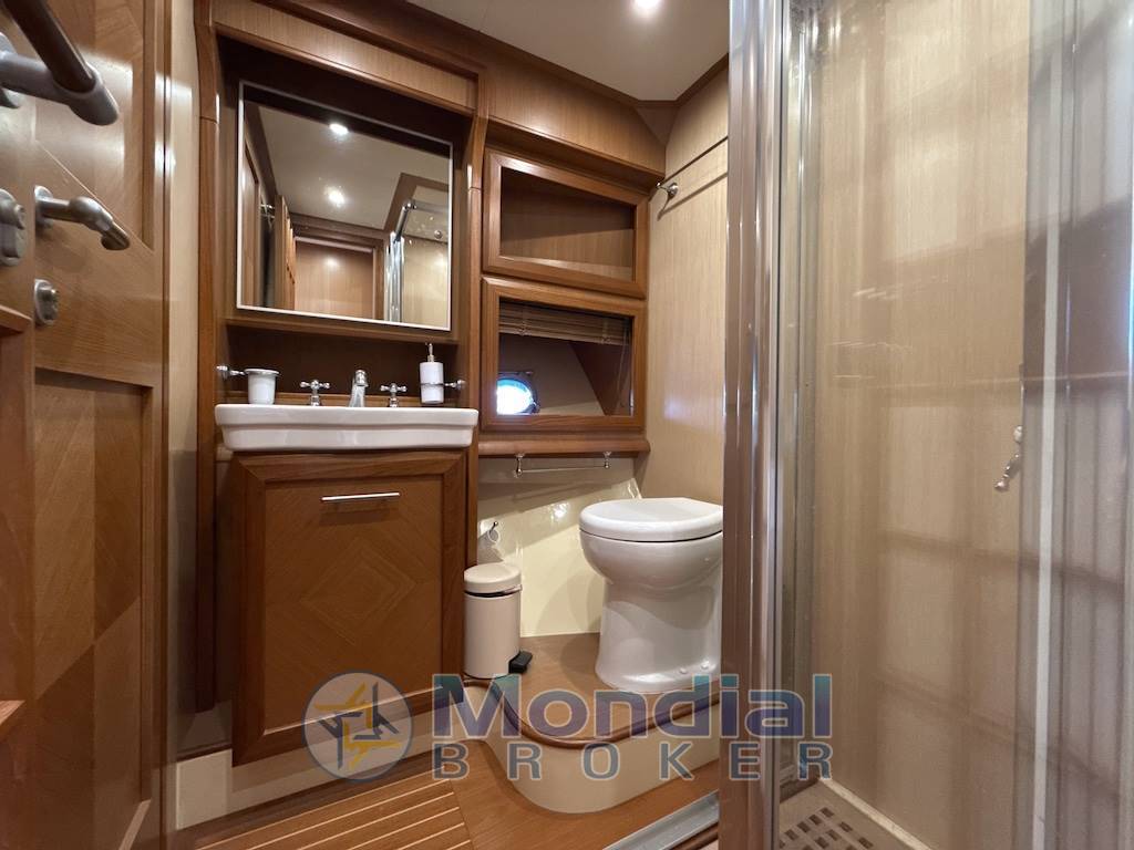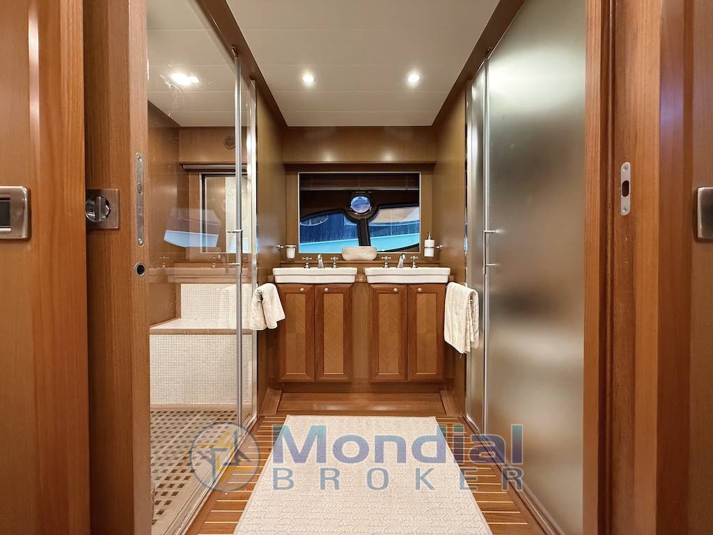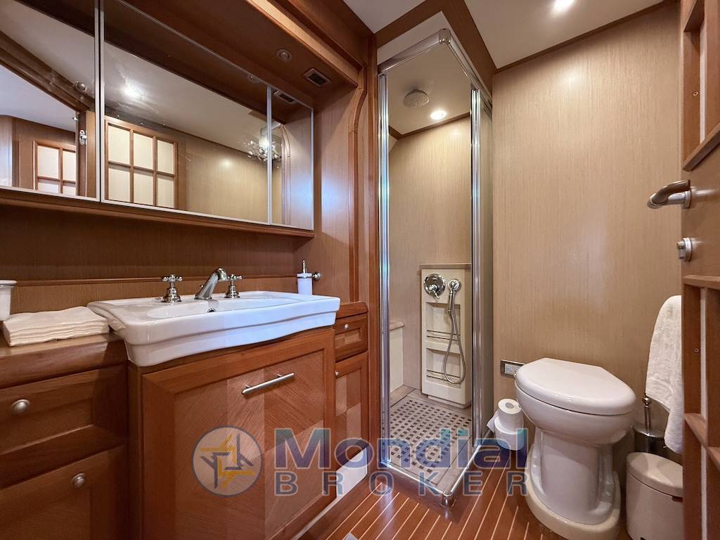 La cabina principale si trova al centro della barca e presenta un ampio letto matrimoniale, un armadio a muro e un bagno spazioso con aree separate per doccia e toilette.