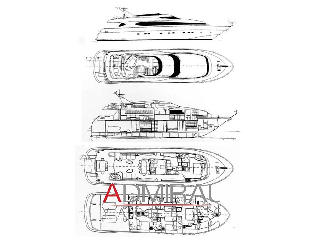 2 Matrimoniale italiana, 2 Matrimoniale francese, 2 Doppia in piano, 2 Cabina equipaggio, 6 Toilette, 1 Dinette, 1 Cucina, 1 Salone, 1 Toilette Equipaggio, 2 Toilette doccia no bidet