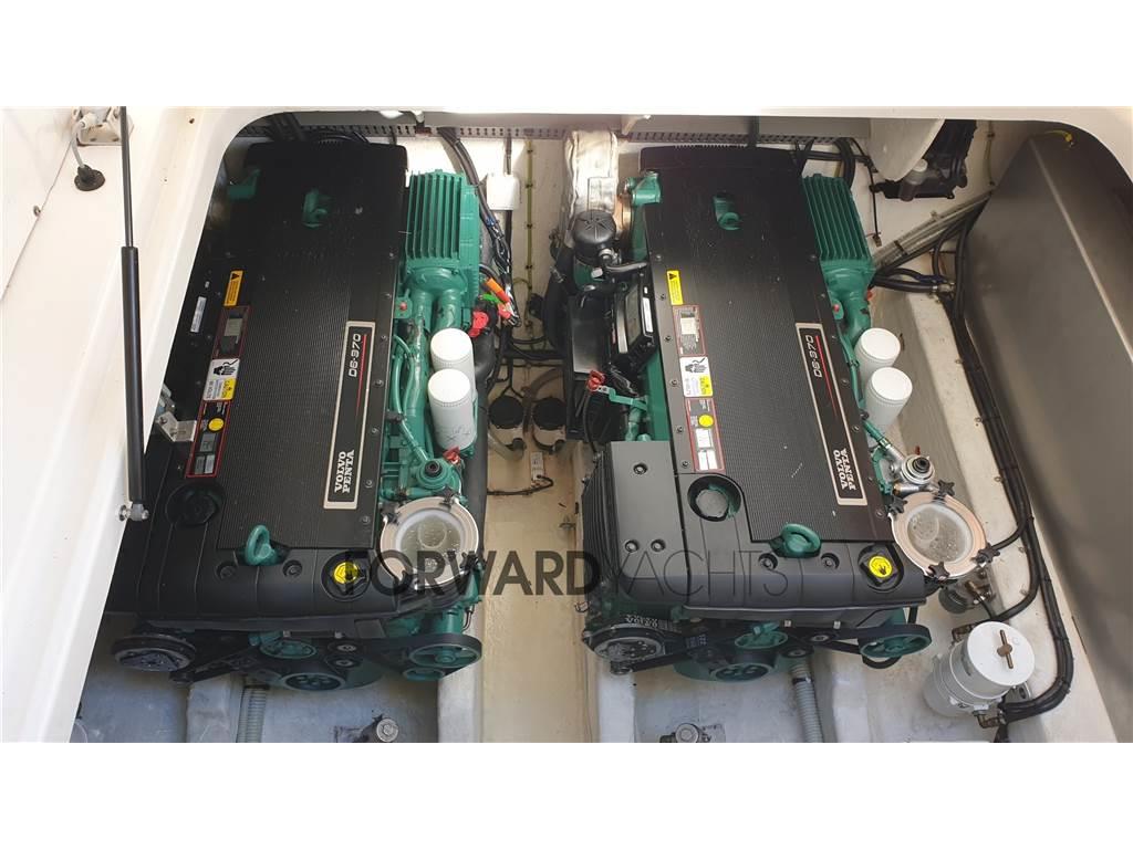 Motorizzazione Volvo Penta, 590 ore moto circa e full optional : elica di prua, generatore, aria condizionata, pozzetto in teak, passerella idraulica, cuscineria completa, hard to elettrico, pilota automatico.