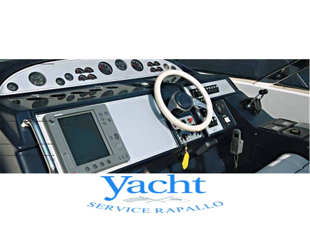 Sedile pilota/copilota (seduta pilota ribaltabile) - Pedana in teak per pilota - Stazione di governo con timoneria idraulica, - Strumentazione controllo motori e allarmi - Bussola magnetica – Angolo di barra - Pilota automatico - Radiotelefono VHF - Chart/Plotter Garmin 5008 Touch screen - Comando stabilizzatori di assetto con indicatore – Quadro sinottico – Interruttori vari.