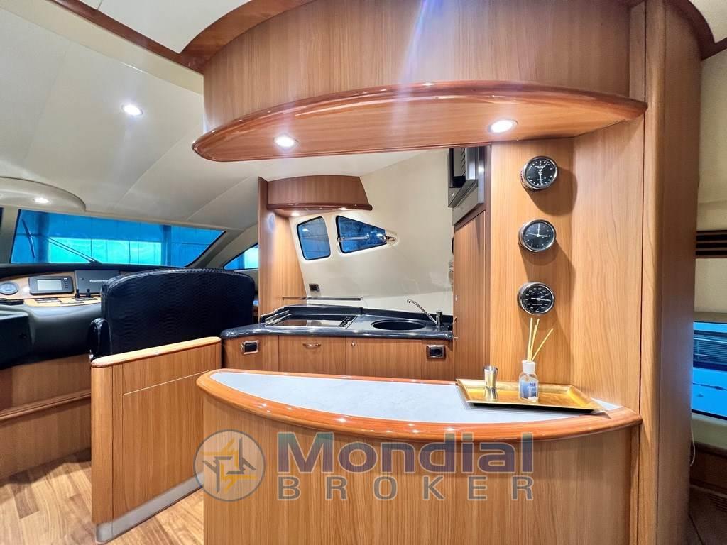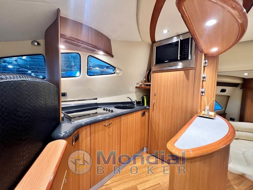 Perfetta la posizione della cucina, defilata lungo la murata di dritta e nascosta da un mobile bar e da un pensile a mezzaluna.