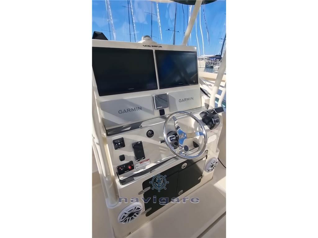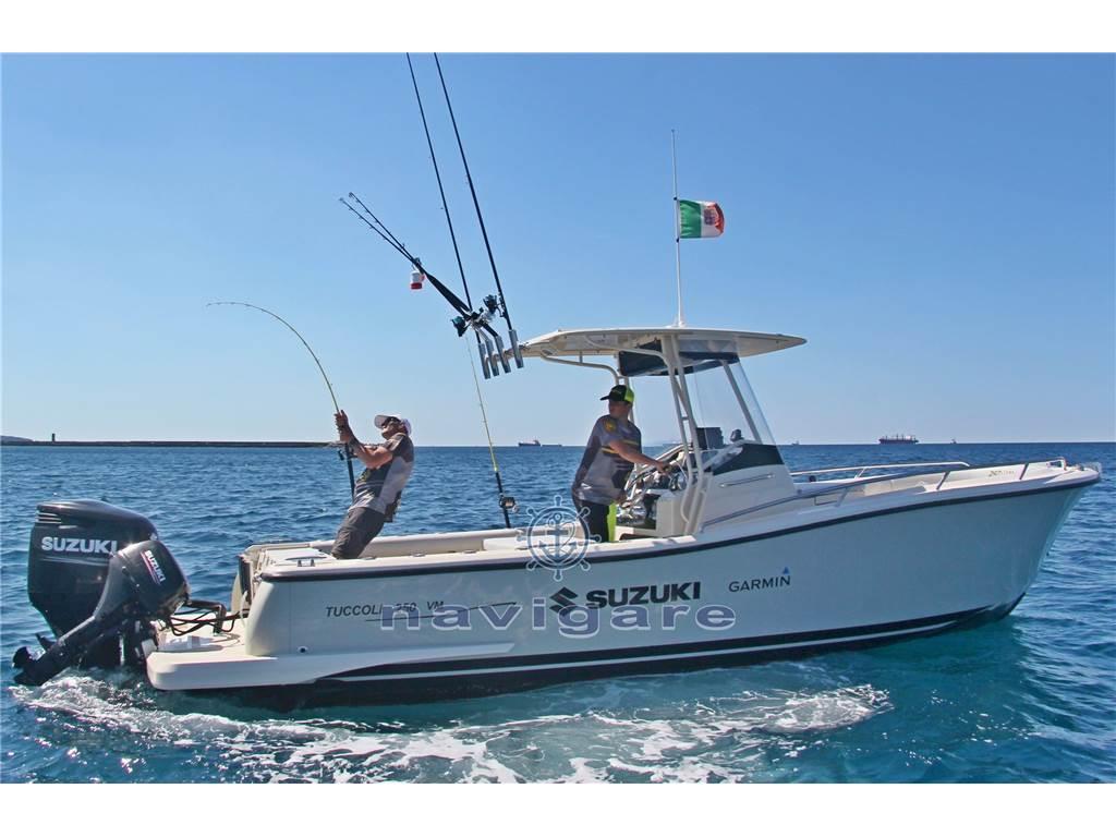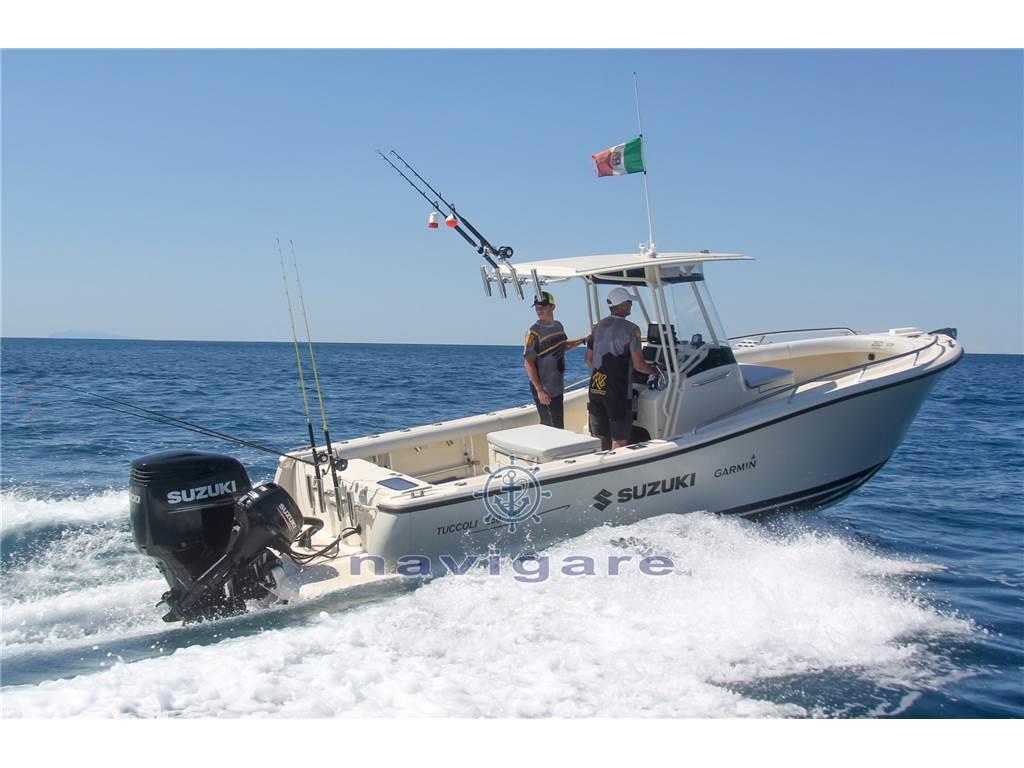 Evoluzione degli storici fisherman Tuccoli, con una nuova coperta e delle rinnovate linee d’acqua per utilizzare al meglio i nuovi e potenti propulsori fuoribordo. Consente di muoversi velocemente sulla zona di pesca anche con mare formato. Le geometrie dello scafo, con la profonda V a prua, l’ampio deadrise di poppa e i pattini laterali di sostentamento garantiscono stabilità sia all’ancora sia nelle scivolate in drifting per lasciarti concentrare sulla pesca e non sul mantenere l’equilibrio.