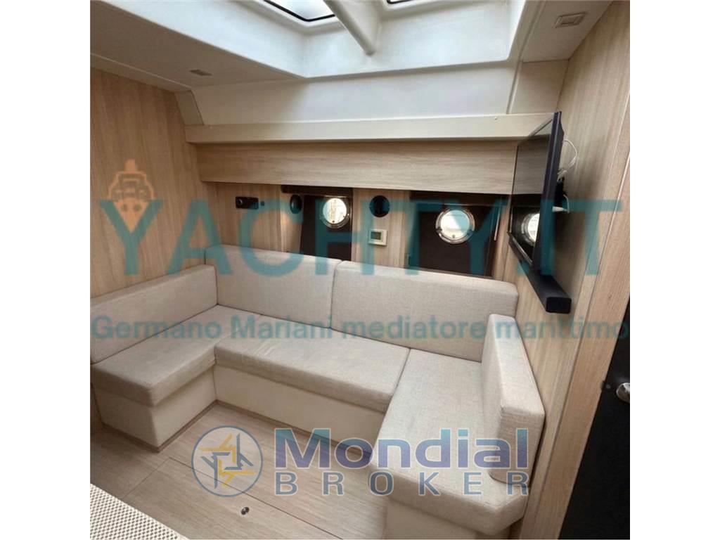 Gli spazi interni accolgono con un’atmosfera raffinata: **cabina armatoriale a prua con bagno privato, cabina ospiti a poppa con tre posti letto e secondo bagno**, oltre a una dinette elegante con cucina completa, pensata per vivere il mare con il massimo comfort.
