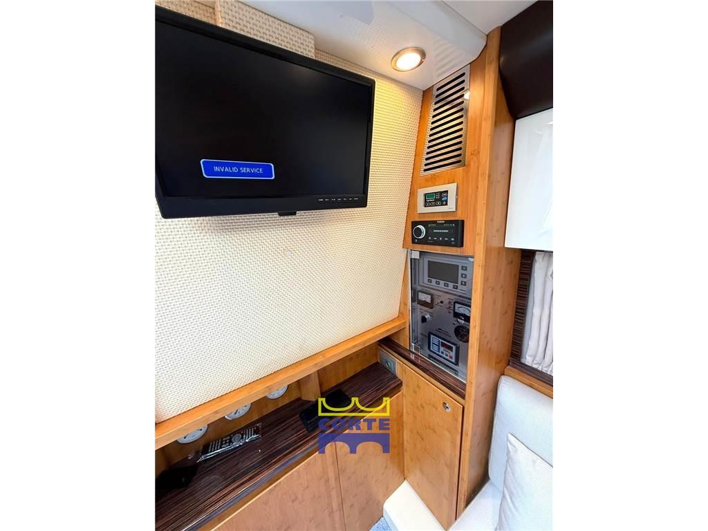 Allarme motore, Allarme sentina, Ancora, Angolo barra, Autoclave, Batterie, Bussola, Caricabatterie, Cavo corrente di banchina, Comando motori elettronico, Display, Doccia esterna (pozzetto con acqua calda), Ecoscandaglio (Raymarine), Garage per tender, Impianto antincendio, Joystick (di manovra), Lavandino nel Pozzetto, Log (Raymarine), Luci di navigazione, Passerella (idraulica), Piattaforma (in teak), Pilota automatico (Garmin), Plotter con antenna GPS, Pompa di sentina automatica, Porta ingresso, Pozzetto Teak, Presa 220V banchina, Radio VHF, Salpa Ancore Elettrico, Scaletta da bagno, Tavolo pozzetto, Winch Elettrico