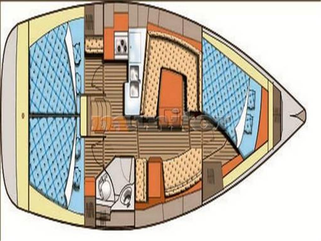 Salone, Cucina, Cabina di prua, 2 cabine di poppa, WC, Pozzetto