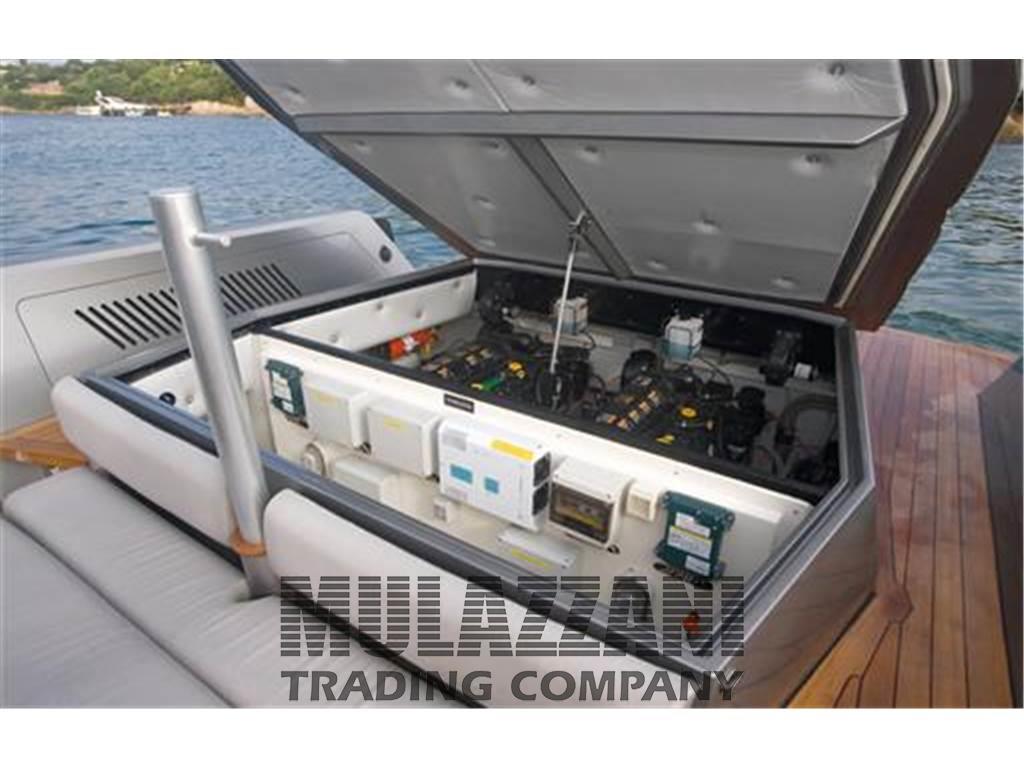 Allarme motore, Allarme sentina, Ancora, Batterie, Bussola, Camminamenti laterali in teak, Caricabatterie, Doccia esterna, Ecoscandaglio, Elica di prua - bow thruster, Flap elettrici, GPS, Luci di cortesia, Luci subacquee, Piattaforma, Pilota automatico, Plotter, Pompa di sentina elettrica, Pompa di sentina manuale, Pozzetto Teak, Presa 220V banchina, Presa acqua banchina, Radar, Radio VHF (ICOM IC-M411), Salpa Ancore Elettrico, Scaletta da bagno, Tromba