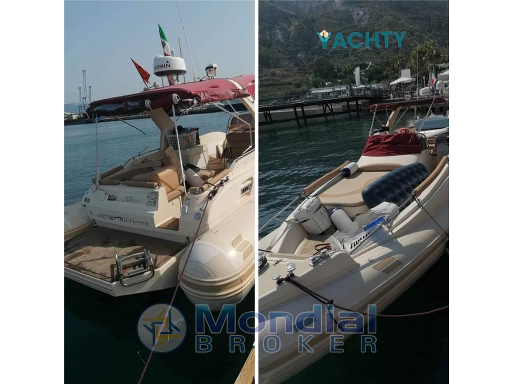 Bimini, Boiler, Cucina, Cuscineria completa, Cuscineria di poppa, Cuscineria di prua, Cuscineria Pozzetto, Frigorifero esterno, Frigorifero interno, Impianto TV, Prese interne 220v, Riscaldamento, Stereo, Telo copriconsolle, Tendalino, WC marino elettrico, Motori e.f.b. t.d. mercruiser bravo 3 da 320 cv cadauno con circa 900 ore di moto, 4 posti letto più 2 nel pozzetto esterno tutto copribile e riparato full optional: tessuto color Panna Exclusive, luci di via, asta porta bandiera con luce 360 e tromba acustica, tendalino parasole, cappottina a chiusura totale, musone di prua in vetroresina con salpa ancora, completo di vericello elettrico, ancora e catena, consolle con parabrezza fumè, check panel elettronico, volante sportivo, cuscineria prendisole di prua e di poppa, tientibene in acciaio inox di prua e di poppa, divano poppiero con tavolo pranzo e completamento letto/prendisole, rivestimento in teak, plancia di poppa, angolo cottura, lavello, frigorifero esterno, frigorifero interno, alza portellone idraulico di poppa, doccia serbatoio e autoclave, wc marino elettrico, arredamento cabina con letto matrimoniale di prua e di poppa, locale separato con wc, doccia e lavandino, impianto luci di cortesia, elica di prua, flaps, autopilota, telecamere sala motori,riscaldamento,