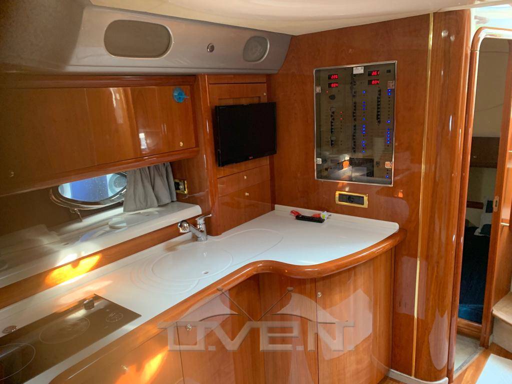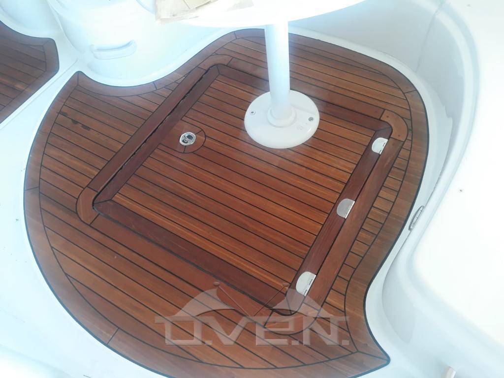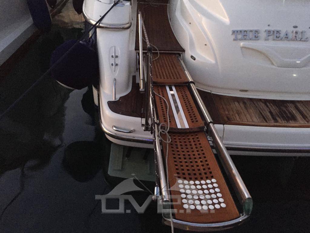 Allarme motore, Doccia esterna, Elica di prua - bow thruster, Flap idraulici, Hard top, Impianto antincendio, Indicatori Flaps, Luci di cortesia, Passerella (idraulica a scomparsa), Piattaforma, 3 Pompa di sentina automatica, Pompa di sentina manuale, Porta ingresso, Pozzetto Teak, Presa 220V banchina, Raddrizzatore, Rollbar, Salpa Ancore Elettrico, Scaletta da bagno, Tavolo pozzetto, Tender, 2 Winch tonneggio di poppa, Winch tonneggio di prua.