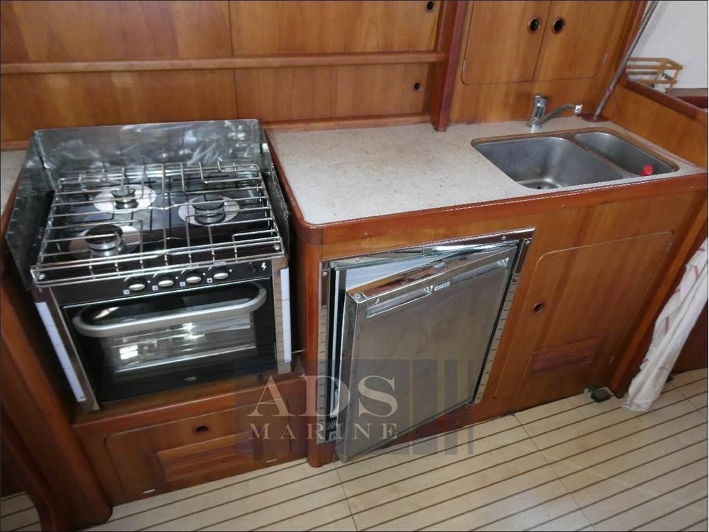 Kitchen: double sink, gas stove with 3 burners, oven Can, Waeco fridge+freezer