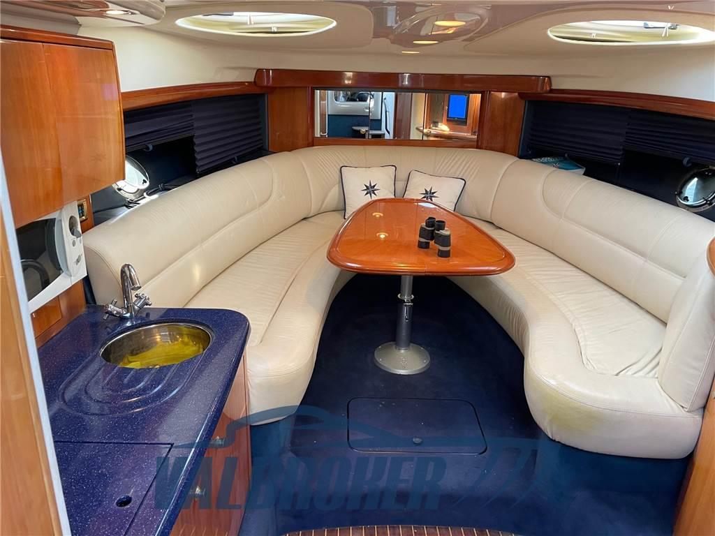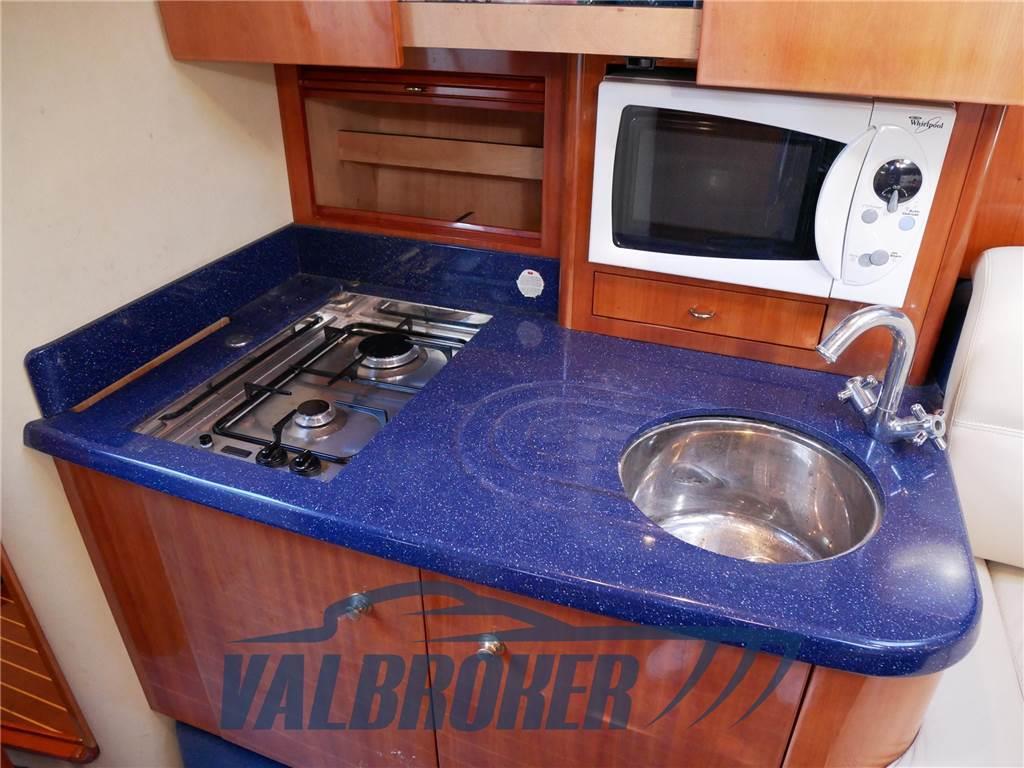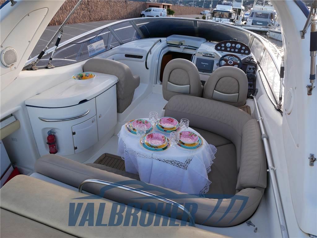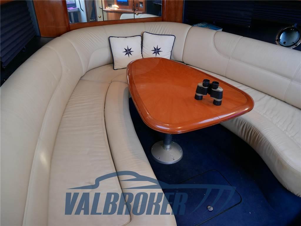 Sottocoperta si trova una spaziosa cabina di poppa matrimoniale una dinette trasformabile e un bagno con doccia. Full optional: aria condizionata caldo/freddo, pilota automatico, elica di prua, garage per tender, GPS. Teak sintetico che non richiedere manutenzione.