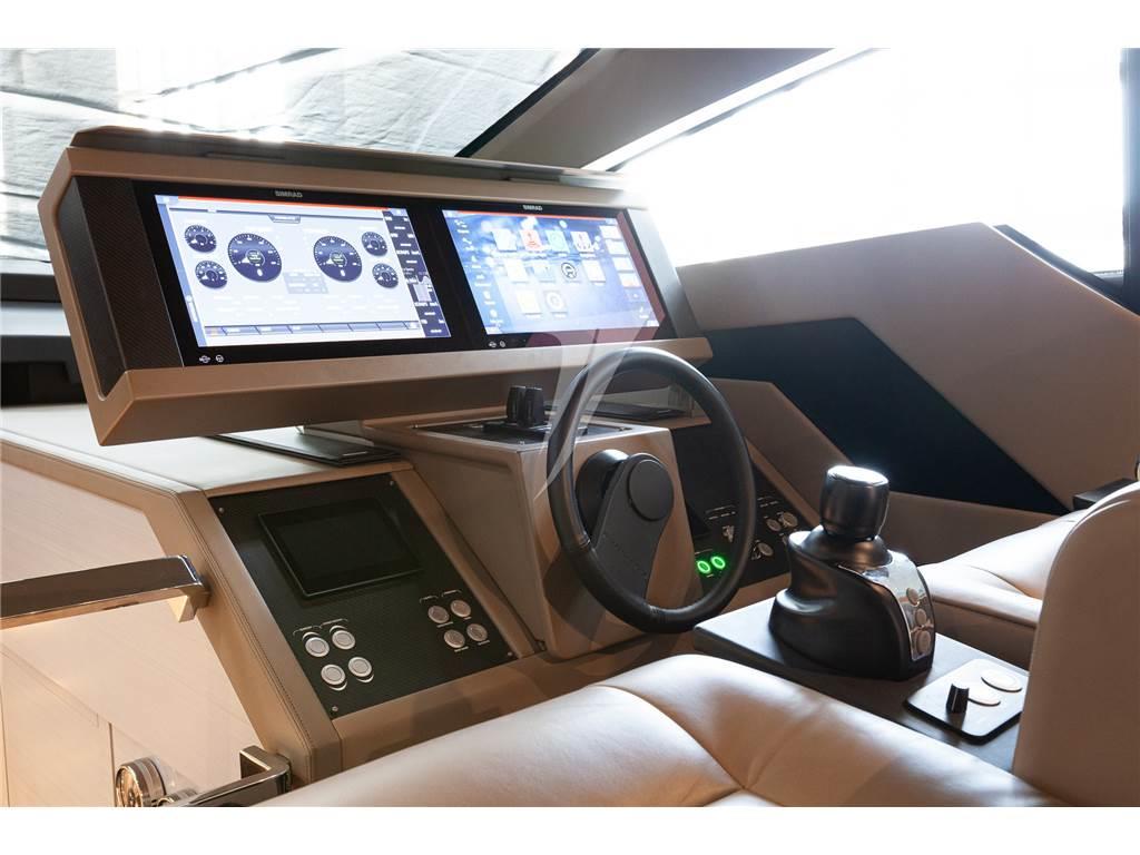 AIS (Simrad), Allarme fumo/gas, Allarme motore, Allarme sentina, Ancora, Angolo barra, Antenna radar, Autoclave, Auto-Trim, Batterie, Bitte Abbattibili, Bussola, Camminamenti laterali in teak, Caricabatterie, Comando motori elettronico, Computer di bordo, Contamiglia, Display (Simrad 19"), Doccia esterna, Ecoscandaglio, Elica di poppa - stern thruster, Elica di prua - bow thruster, Flap elettrici, Garage per tender, GPS, Hard top, Impianto antincendio, Impianto Aria Compressa, Indicatori Flaps, Joystick, Lavaggio catena, Lavandino nel Pozzetto, Luci di cortesia, Luci subacquee, Passerella, Pilota automatico, Plotter, Plotter con antenna GPS, Pompa di sentina automatica, Porta ingresso, Pozzetto Teak, Presa 220V banchina, Presa acqua banchina, Radar, Radio VHF, Salpa Ancore Elettrico, Scaletta da bagno, Sedile Copilota, Sistema di posizionamento dinamico, Stabilizzatori (Seakeeper), Tavolo pozzetto, Tavolo Salone Abbattibile, Tientibene con cancelletti, Tromba, Winch Elettrico, Winch tonneggio di poppa, Winch tonneggio di prua