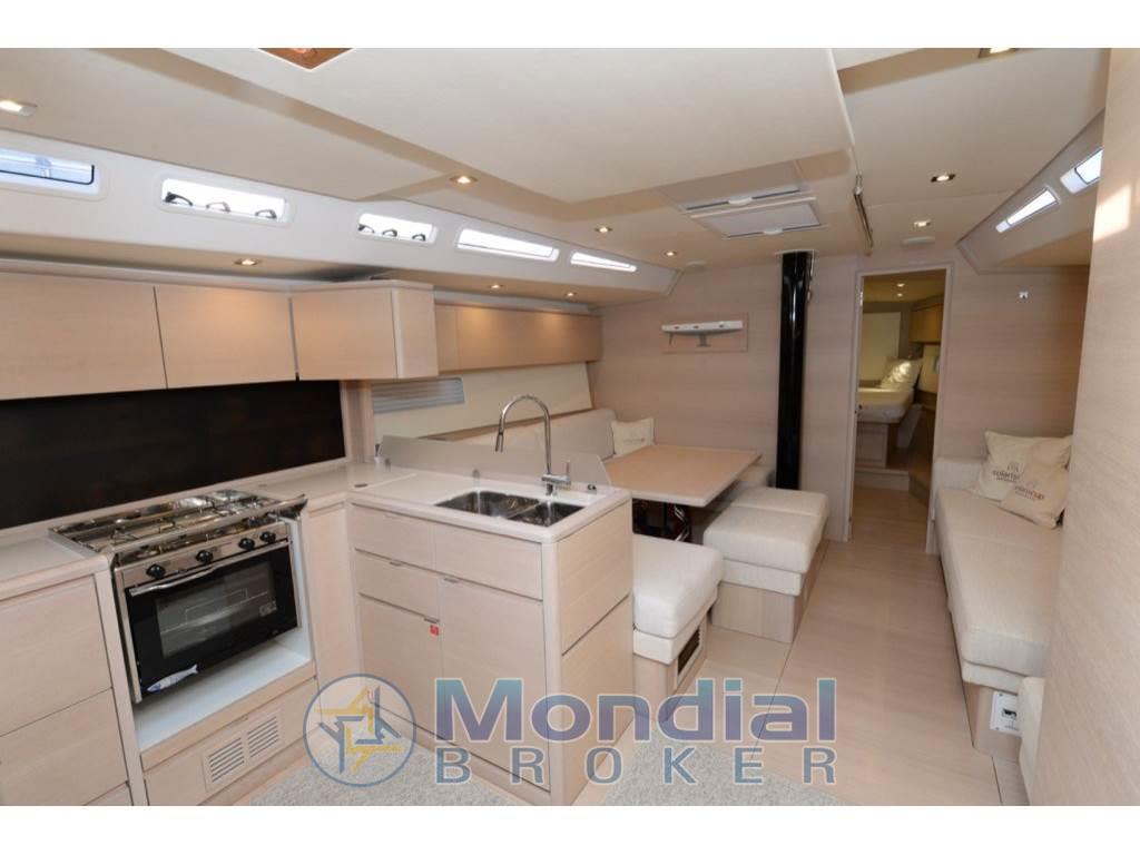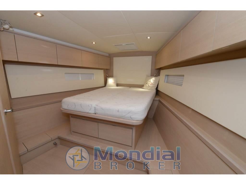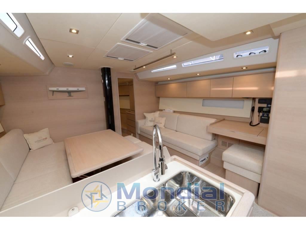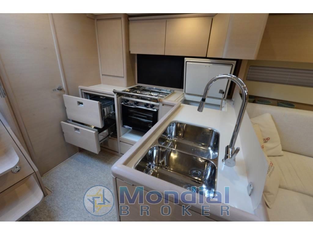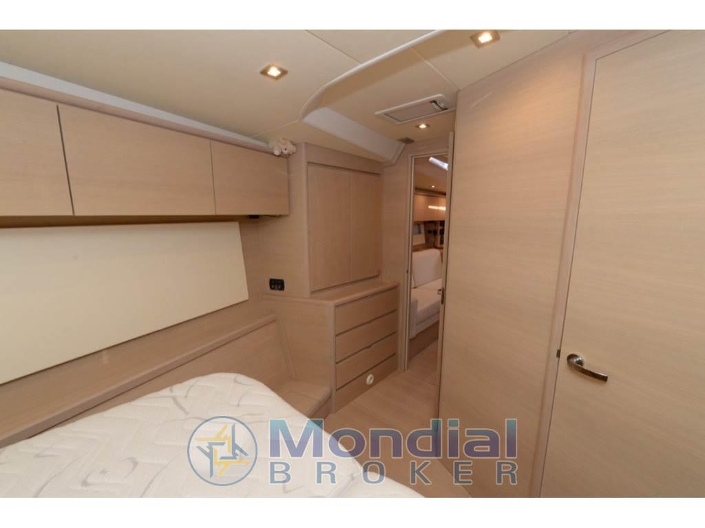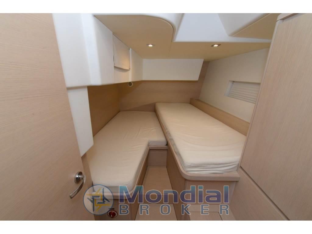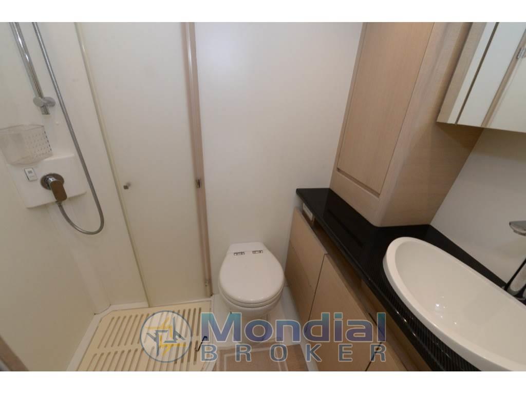 INTERNI IN ROVERE SBIANCATO, Cabina di poppa sx a due letti singoli a livelli sfalsati, divano davanti al tavolo dinette, piano cucina in corian bianco, piaano lavelli wc in carbonio, luci da lettura orientabilinin dinette e cabine, cuscineria esterna più rivestimento in spugna custom, sacche porta scotta, passerella in carbonio 2 cime d'ormeggio, dotazioni di sicurezza parziali, boccaporti solimar a filo ponte, rotaia fiocco autovirante