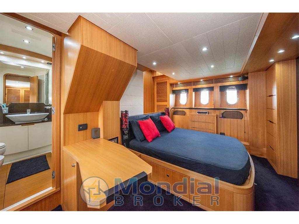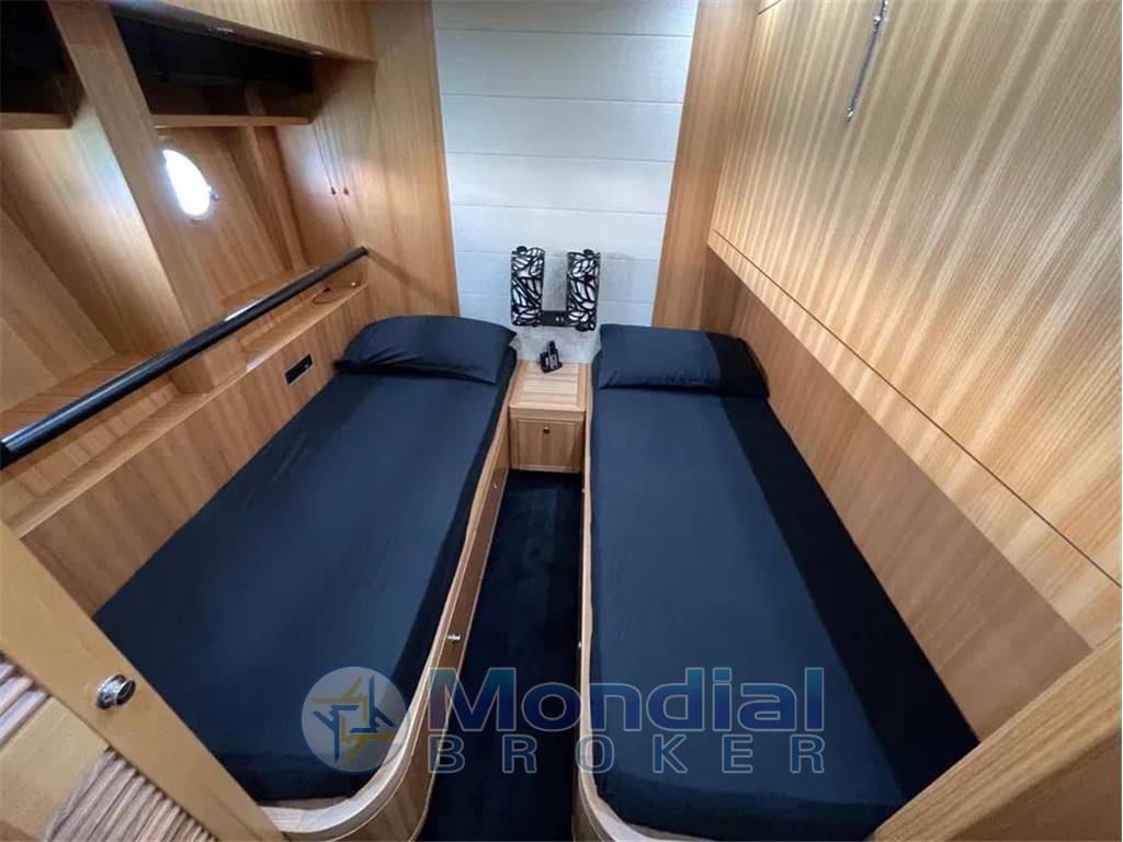 Cabina armatoriale a tutto baglio a centro barca su ponte inferiore, con letto queen size,TV 55",2 spaziosi armadi e bagno con doccia,lavandino e wc elettrico; Cabina Vip a prua con TV 24",armadio, bagno con doccia,lavandino e wc elettrico; Cabina ospiti a dritta con letti in piano e 3°letto pullman; Cabina singola a sinistra. Bagno ospiti in comune con accesso dal corridoio, doccia lavandino e wc elettrico.