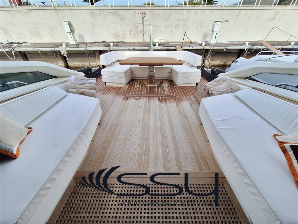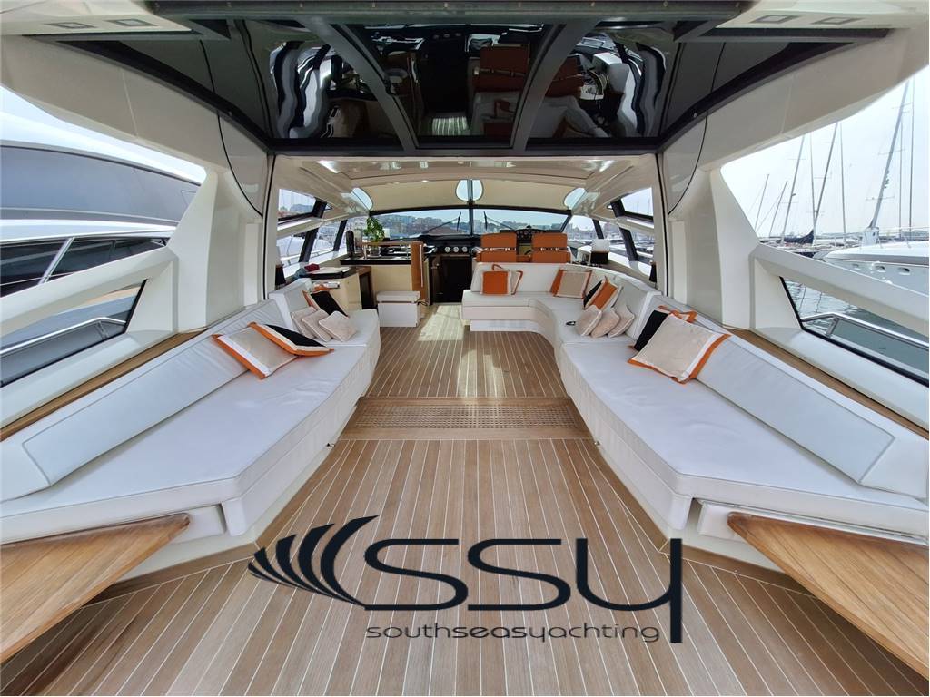 Spaziosissimo salone connesso al pozzetto da una porta con vetrata interamente apribile elettricamente, due divani contrapposti di cui uno angolare e l’altro dritto, angolo TV con Sony Bravia, decoder satellitare, impianto stereo Fusion, angolo bar con lavello, icemaker e frigobar Vitrifrigo, due sedute guida di cui a regolazione elettrica + divano di poppa con tavolo telescopico trasformabile in prendisole;
