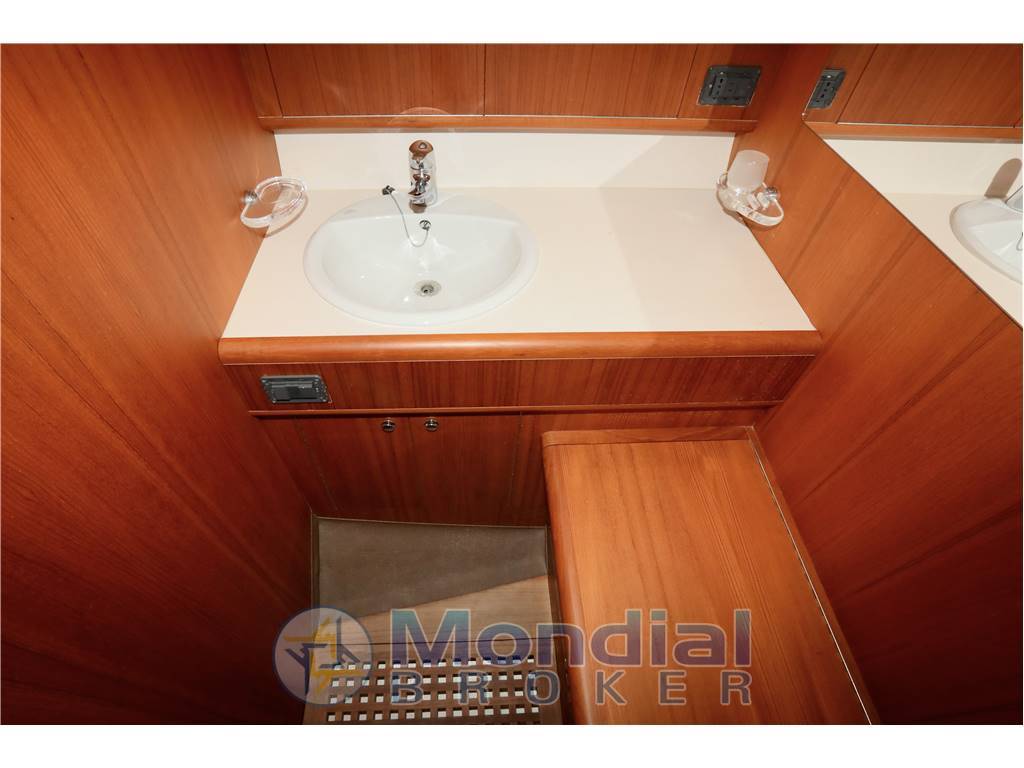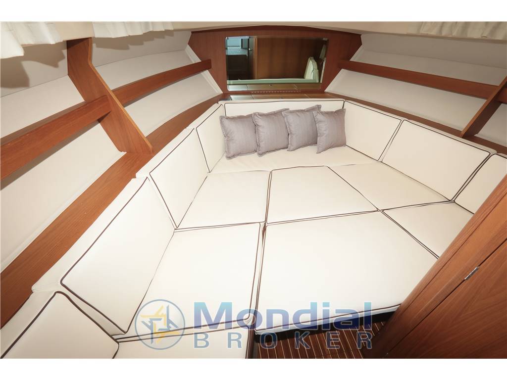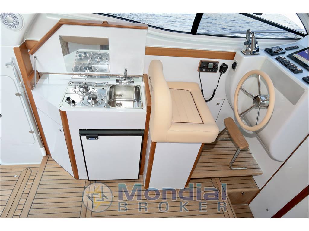 Cabina open space, bagno con doccia, ampia armadiatura, pozzetto completo di divanetto, plancia di comando, mobile cucina con lavandino, piastra cottura a gas, frigorifero.