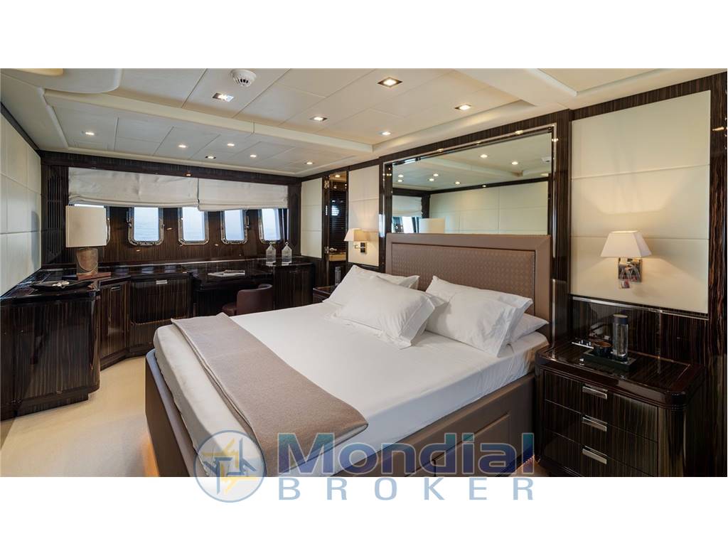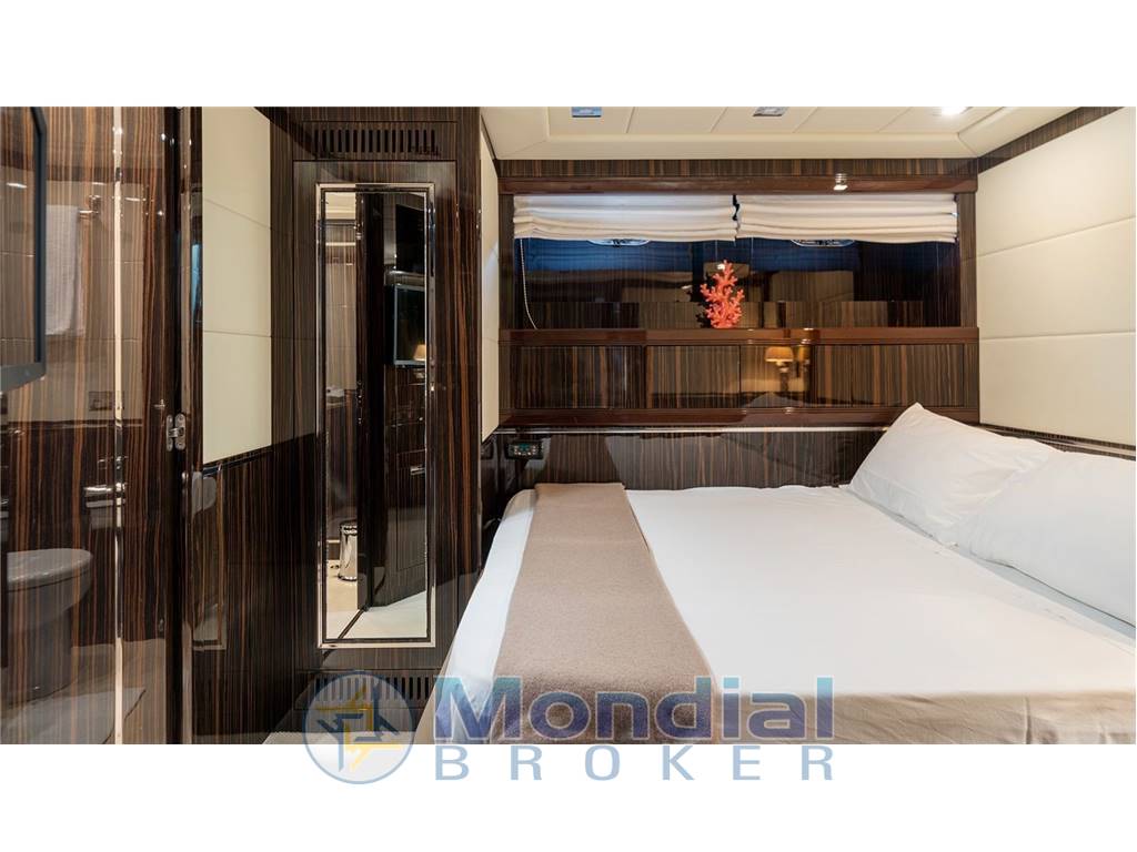 Cabina armatoriale full beam, situata a centro barca, con letto king size, cabina armadio, cassaforte, ampio bagno con box doccia in cristallo, TV LCD Sony e sistema Hi-Fi Denon.