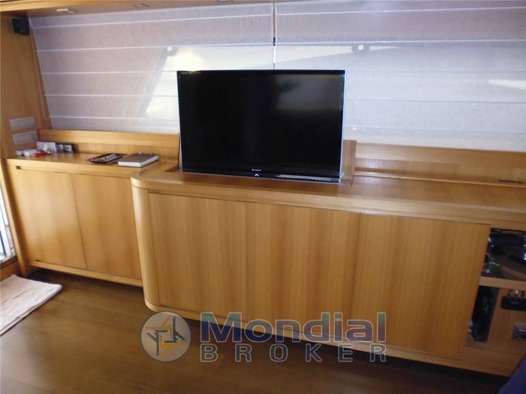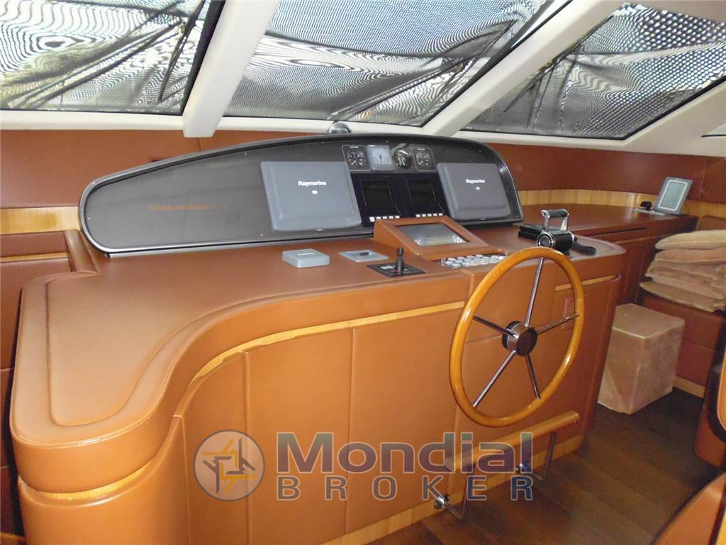 Timoneria: radar 64 ml - 2 monitor multifunzione E120 - pilota automatico ST6001 - tridata ST60 - indicatore angolo di barra ST60 - VHF RAY240Fly: monitor multifunzione E80 - rip. pilota ST6001 - tridata ST60 - indicatore angolo di barra ST60 - VHF RAY240. Tutti gli elettronici sono RaymarineAudio VideoTV LCD 32” e Hi-Fi in salone - TV LCD 20” con HI-FI nella Cabina Armatore - TV LCD 20” e Hi Fi in cabina VIP - TV LCD 20” nelle cabine ospiti. Impianto CD/car stereoin timoneria e nelle cabine equipaggio.Antenna TV satellitare TV SAT KVH G6 (incluso decoder)ImpiantiElica di prua ed elica di poppa idraulica con controlli in plancia e fly - aria condizionata (90.000 BTU) - dissalatore 180 l/h - terza stazione di controllo a poppa con comandoa distanza - impianto telefonico interno in tutte le cabine - inverter - flap