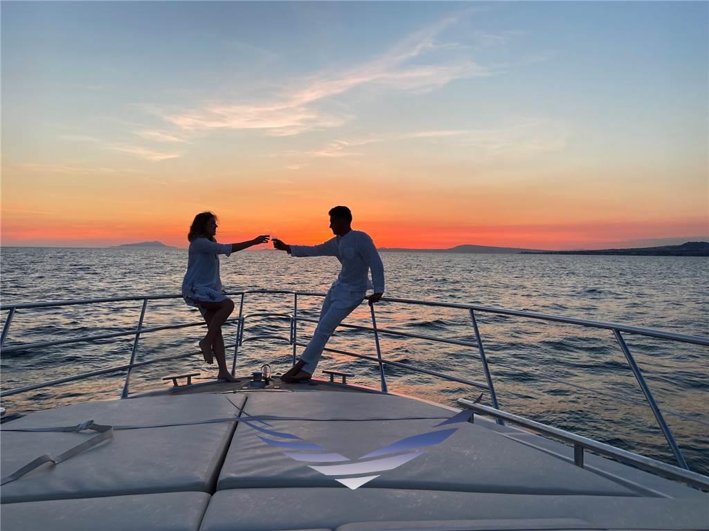 Gli ospiti possono godersi il sole e il mare nelle ampie aree del ponte, rilassandosi sui comodi materassini a prua o sorseggiando un drink rinfrescante sul divano a poppa, protetti dall’ombra elegante del tendone parasole. Ogni dettaglio è pensato per garantire comfort e relax, trasformando ogni momento a bordo in un’esperienza di puro piacere.