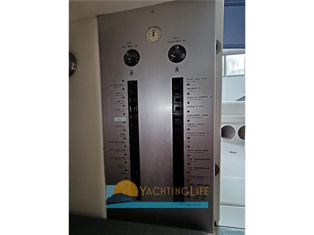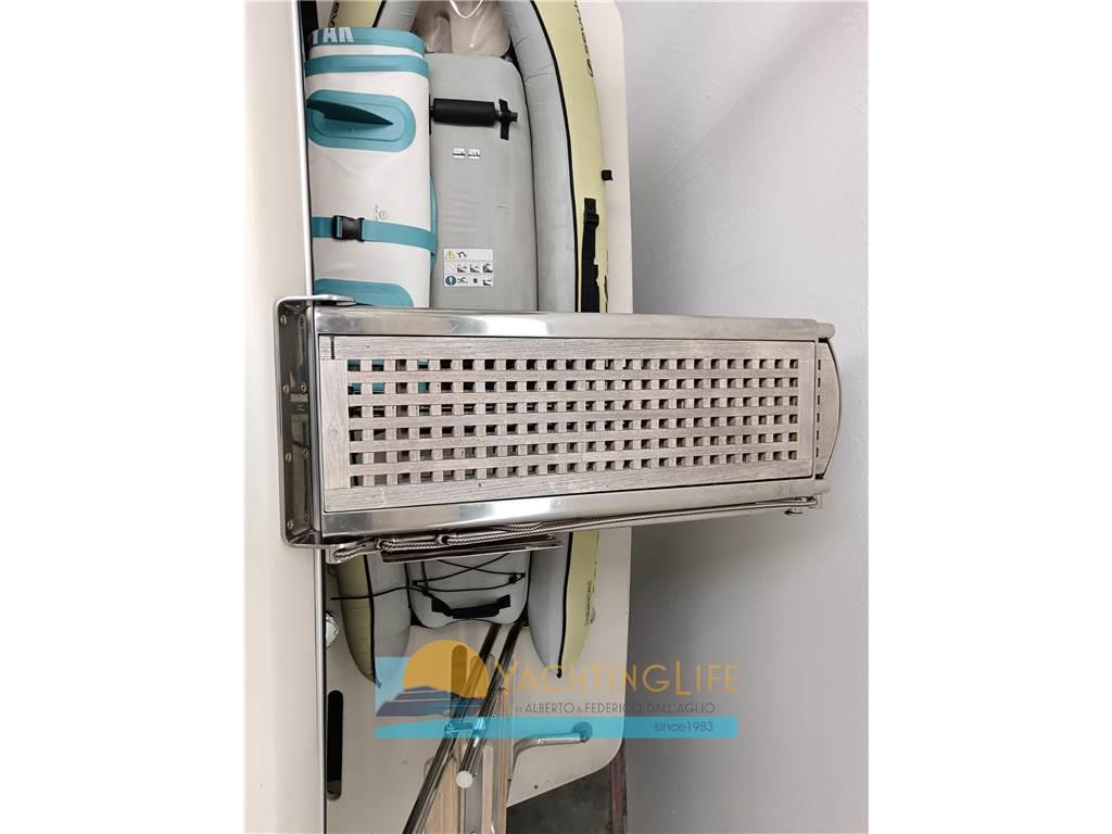 Allarme motore, Ancora, Angolo barra, Autoclave, Batterie, Bussola, Colorazione speciale (Scafo blu), Doccia esterna, Ecoscandaglio, Flap idraulici, Indicatori Flaps, Passerella (Idraulica), Piattaforma, Pilota automatico (Raymarine 2023), Plotter con antenna GPS (Raymarine), Pompa di sentina automatica, Pompa di sentina elettrica, Porta ingresso, Presa 220V banchina, Radio VHF, Salpa Ancore Elettrico, Scaletta da bagno, Tavolo pozzetto, Tromba