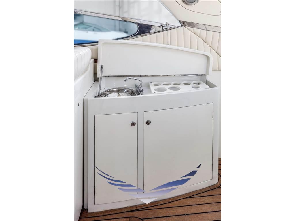 Ancora, Cavo corrente di banchina, Doccia esterna, Elica di prua - bow thruster, Fissaggio dell’ancora, Flap idraulici (elettroidraulico), Lavandino nel Pozzetto, Luci di cortesia, Piattaforma (teck), Pompa di sentina automatica, Pompa di sentina elettrica, Pozzetto Teak, Rollbar, Salpa Ancore Elettrico (comando prua+plancia), Scaletta da bagno, Tromba, Winch Elettrico (prua).